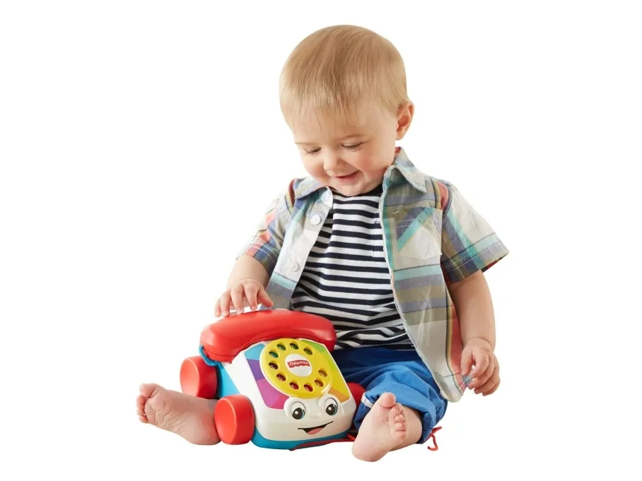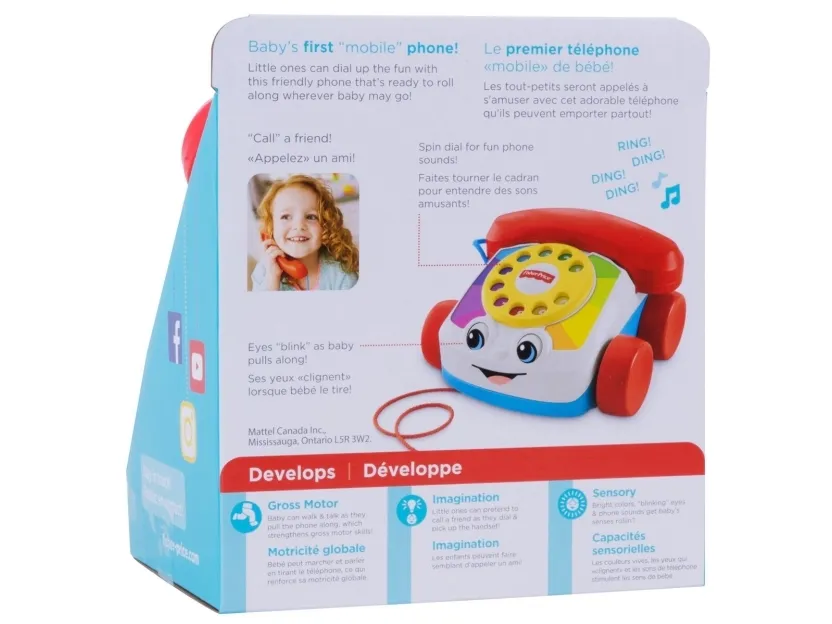 Den klassiska Fisher-Price® Chatter Telephone®-leksaken har ringt igång leken sedan 1961! Med vänligt ansikte, snurrande skiva, roliga ringsignaler och ögon som rör sig upp och ner när den dras på golvet får den här klassiska leksaken barnet att börja prata och gå som ett proffs!Barnen kan sitta och leka eller dra omkring leksakstelefonenChatter Telephone® har roliga ringande ljud och ögon som rör sig upp och nerLär barnet siffrorna 0-9Uppmuntrar till tidiga rollspel när barnen låtsas ”ringa”För bebisar och småbarn som är 12 månader och äldre