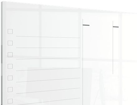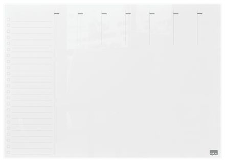 • Magnetisk Ugentlig planlægningstavle med dry erase overflade og stilfuldt rammeløst design. • Den perfekte whiteboard-planlægger til notering af påmindelser eller lister; skriv, rens og start igen. • Med skridsikre puder forbliver notesblokken på plads på enhver arbejdsflade, når den ligger fladt; så du nemt kan skrive og vedhæfte noter. • Whiteboard-overflade af glas giver ultra-sletning og den højeste modstandsdygtighed over for blækpletter og pennemærker. • 25 års garanti på overfladen