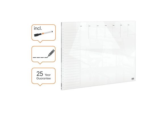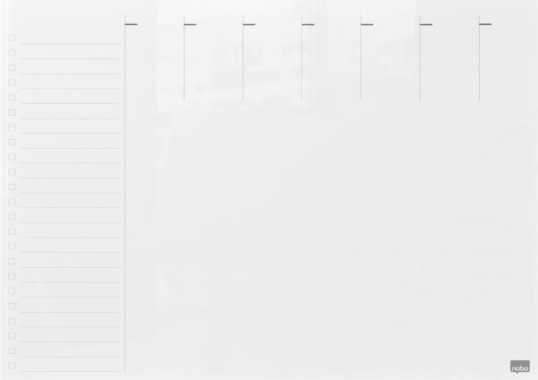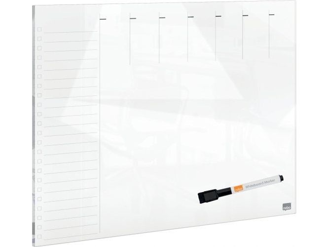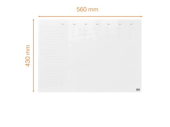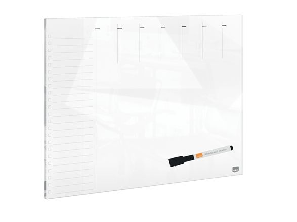 Denne whiteboard ugentlig planner i glas er et nyttigt værktøj til at holde orden hjemme eller på arbejdspladsen. Med sit rammeløse design og førsteklasses glas whiteboard-finish gør dry erase overfladen med et ugentligt gitter det til en ideel whiteboard-planlægger til notering af påmindelser, aftaler og lister. Glasoverfladen af høj kvalitet giver også den højeste modstandsdygtighed over for pletter og pennemærker; skriv, tør af og start igen. Leveres med en whiteboardpen. Størrelse 430x560 mm.