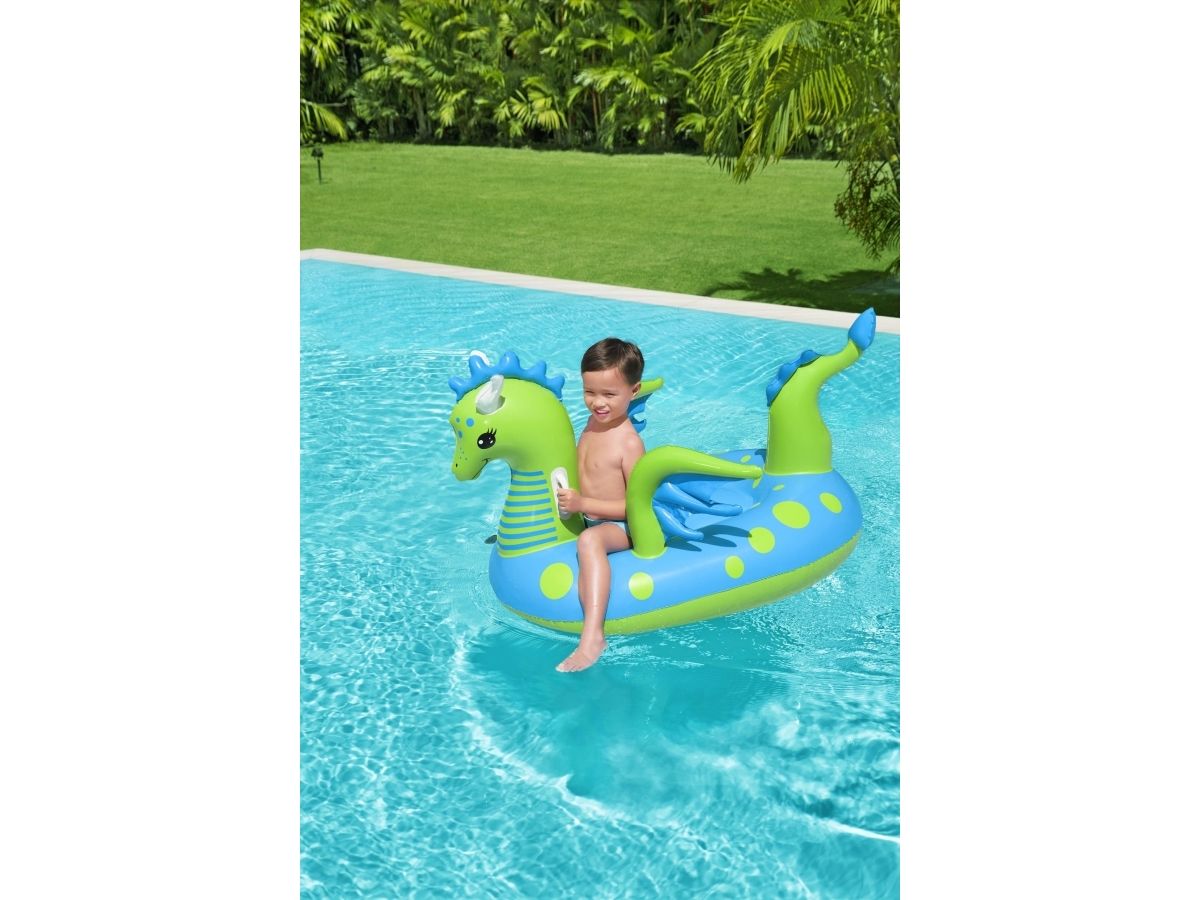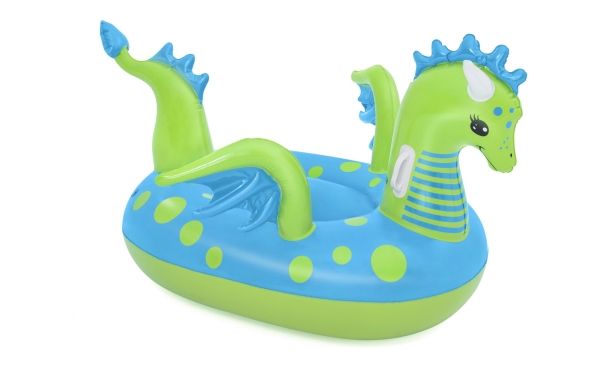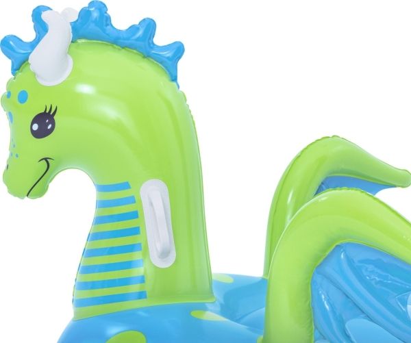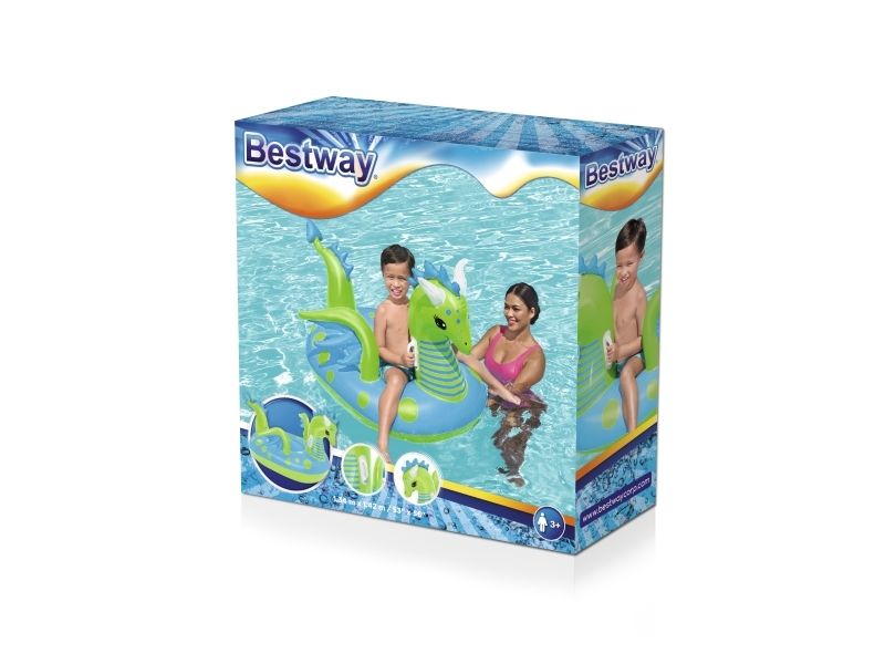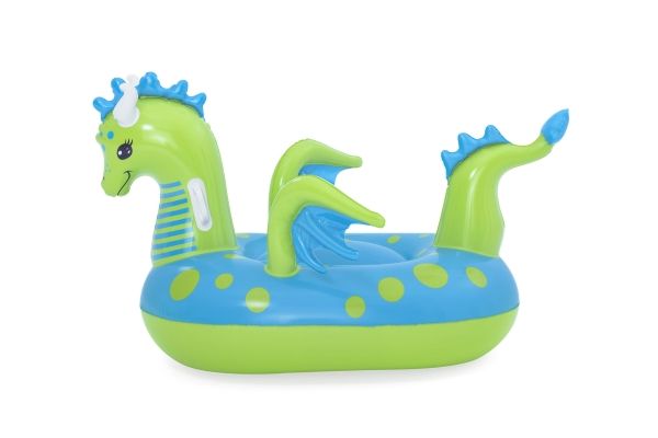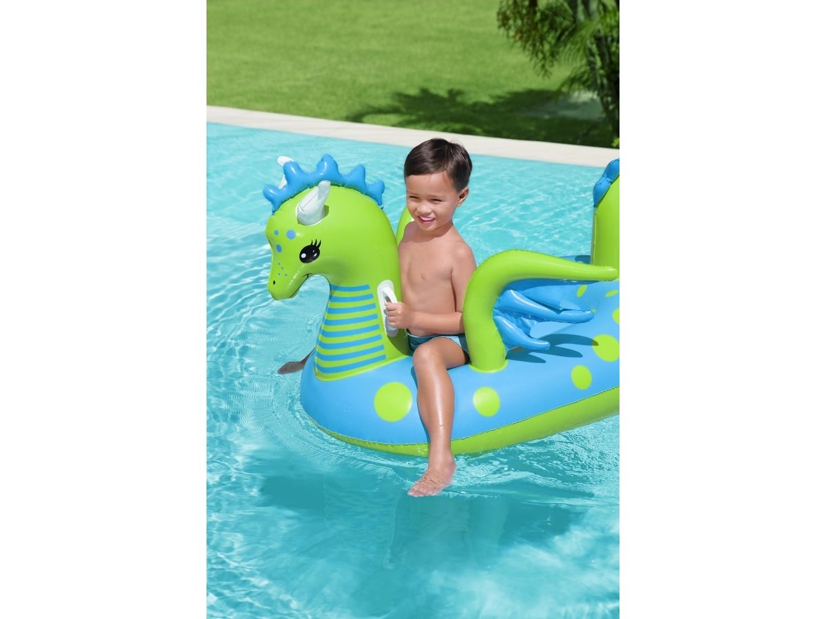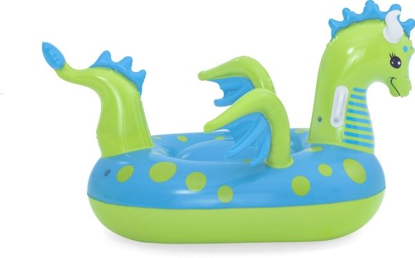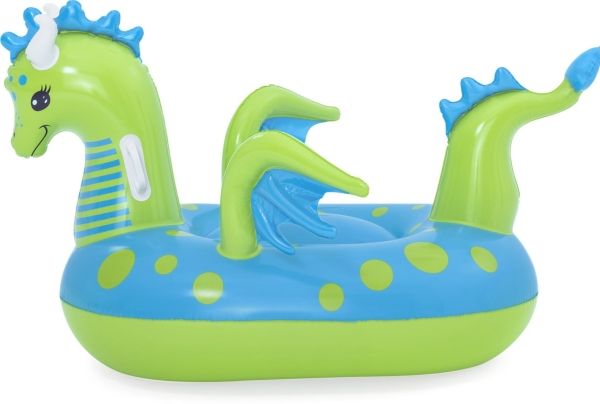 Let your imagination take flight this summer with the Bestway Fantasy Dragon Ride-On! Hop on this friendly beasts back and soar across the pool. Kids will be safe and secure with its easy-to-grip, water ready, heavy-duty handles. This legendary serpent has an inflatable head, wings and tail that extend away from the body of the float to create an engaging fun adventure in the pool or at the beach. Grip the dragon’s neck or relax against the dragon’s tail. This picture-perfect friend will bring life and joy to the party. The whimsical colors and playful graphics of this ride-on will brighten your child’s summer and bring a smile to face to their face. The Fantasy Dragon Ride-On is durable and long lasting. Easy inflation makes it possible to set up the ride on quickly, and easy deflation makes it simple to store to use year after year. Tame this floating dragon and bring your childs fairytale to life!