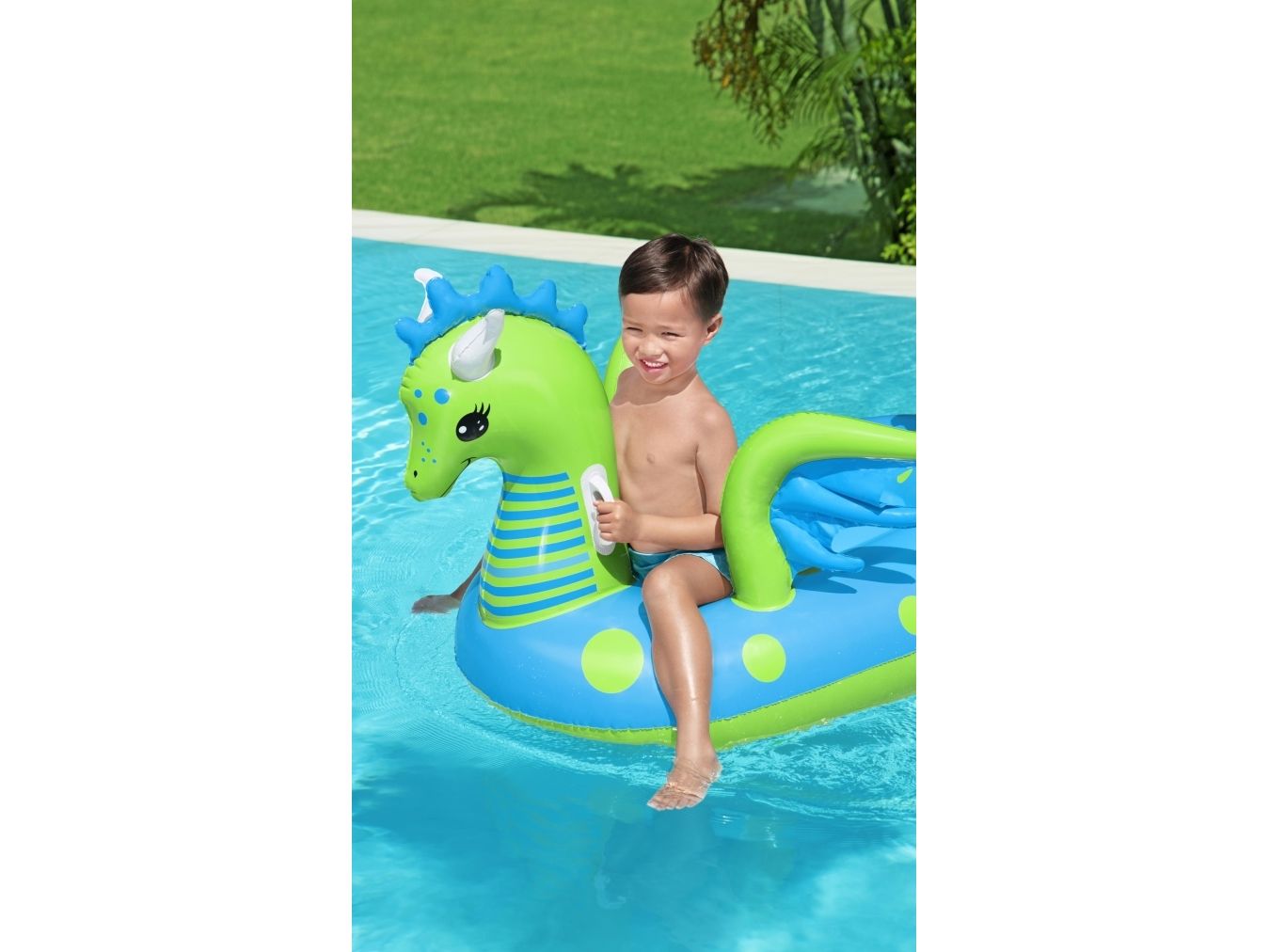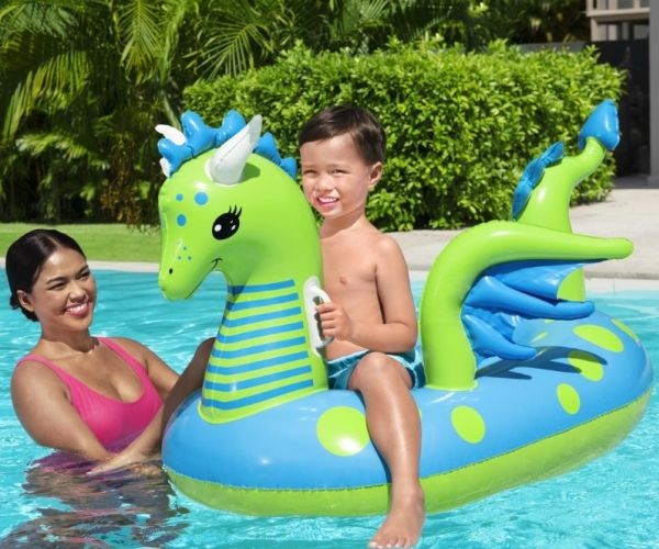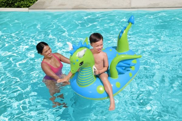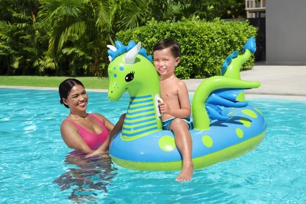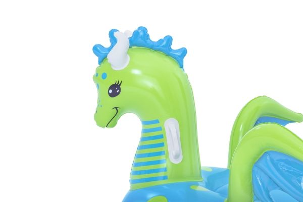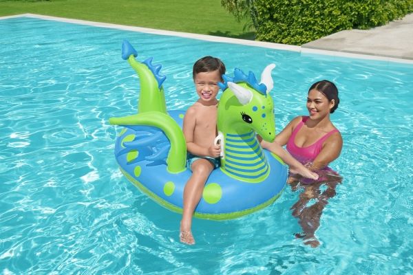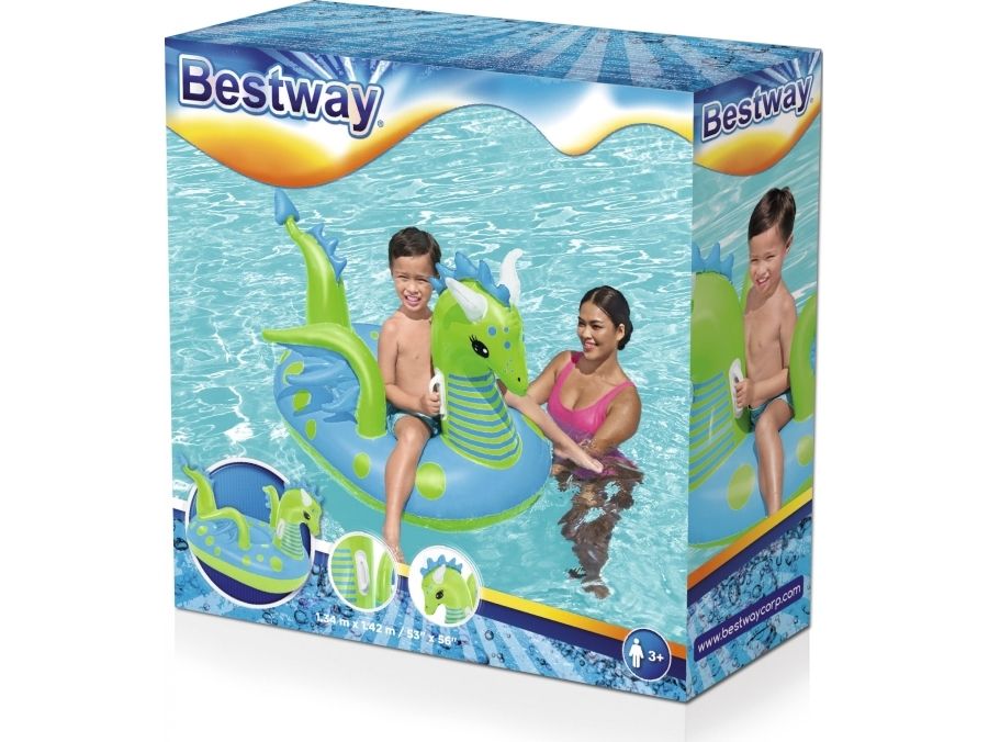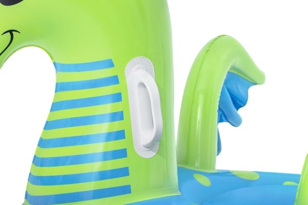 Let your imagination take flight this summer with the Bestway Fantasy Dragon Ride-On! Hop on this friendly beasts back and soar across the pool. Kids will be safe and secure with its easy-to-grip, water ready, heavy-duty handles. This legendary serpent has an inflatable head, wings and tail that extend away from the body of the float to create an engaging fun adventure in the pool or at the beach. Grip the dragon’s neck or relax against the dragon’s tail. This picture-perfect friend will bring life and joy to the party. The whimsical colors and playful graphics of this ride-on will brighten your child’s summer and bring a smile to face to their face. The Fantasy Dragon Ride-On is durable and long lasting. Easy inflation makes it possible to set up the ride on quickly, and easy deflation makes it simple to store to use year after year. Tame this floating dragon and bring your childs fairytale to life!