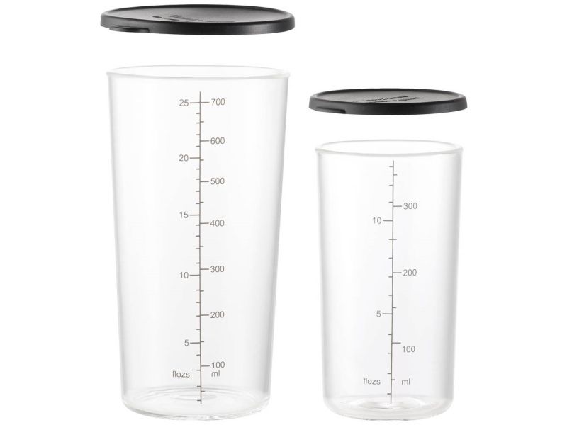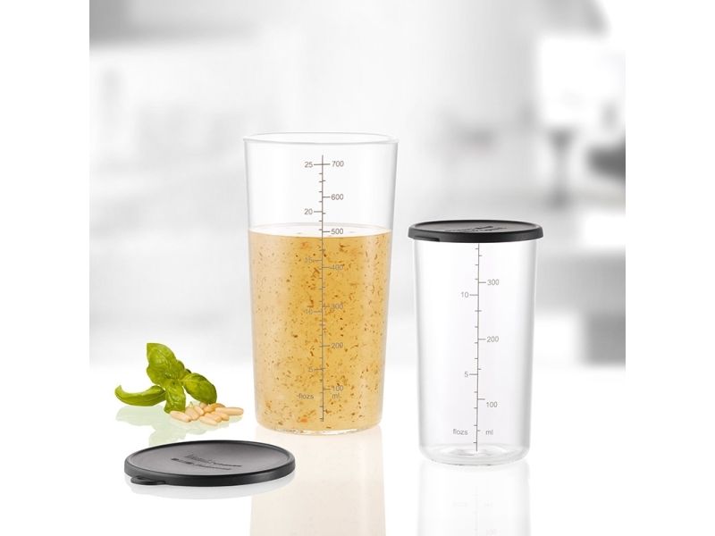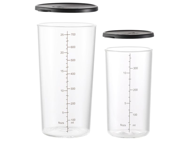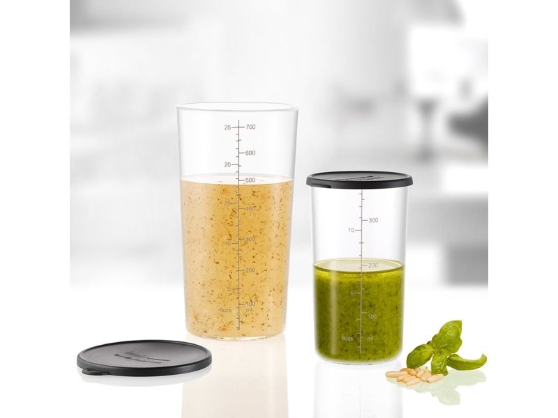 The UNOLD ESGE-Zauberstab measuring cup set is an essential accessory for any kitchen, bringing together functionality and durability. This set includes two measuring cups, one 700 ml and one 400 ml, both made from borosilicate glass, known for its resistance to thermal shock. Whether you're measuring ingredients for baking or cooking, these cups have you covered. The set also comes with a silicone lid, perfect for storing leftovers or pre-prepped ingredients. Easy to clean, both cups are dishwasher and microwave safe, making them as convenient as they are versatile. Enhance your cooking and baking experience with this essential set, designed to meet all your measuring needs.