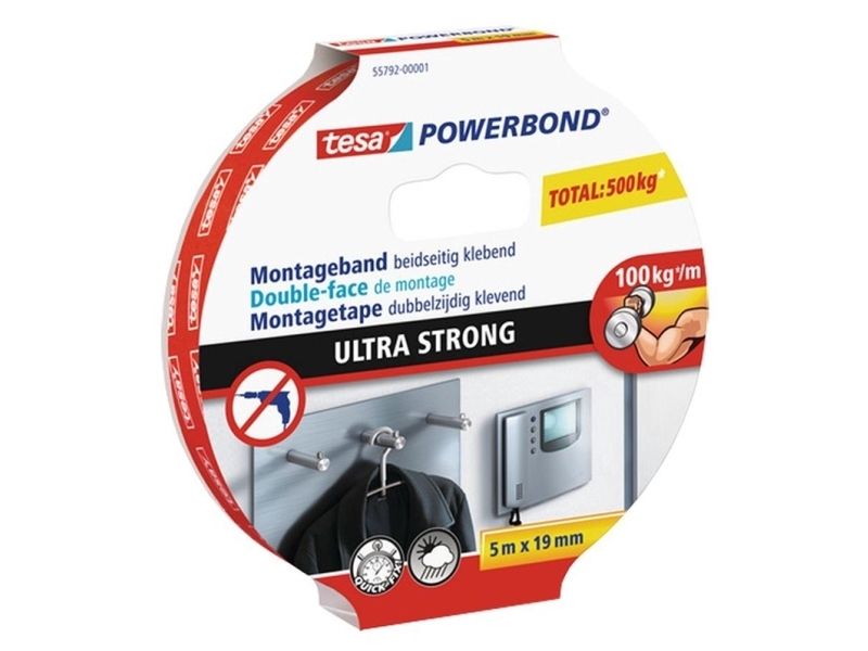 Heavy-duty double-sided tesa mounting tape for a wide range of household applications, especially for fixing small objects indoors.