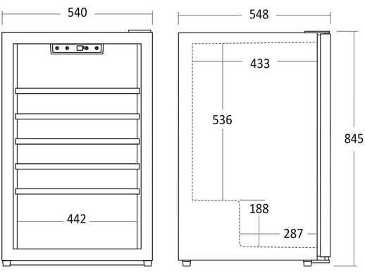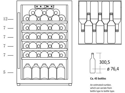 OBS! Den angivna flaskkapaciteten beräknas med en flaska Bordeaux som standard och utan hyllor i skåpet. Dvs. att det faktiska antalet flaskor som skåpet kan rymma, med hyllor monterade, kommer att vara mindre än den mängd som anges i produktspecifikationerna.
