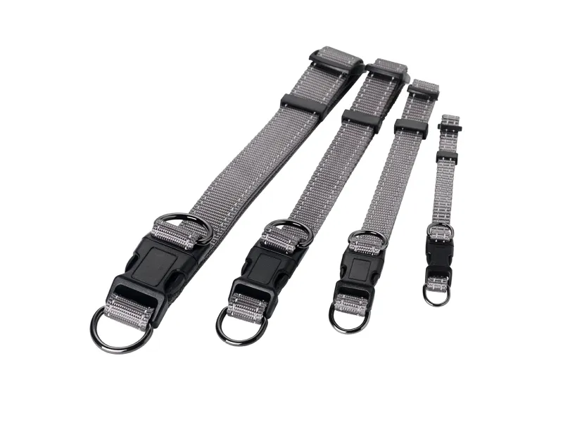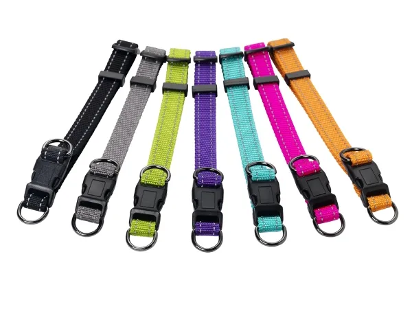Ställbart reflekterande halsband i nylon. Klickspänne för att enkelt kunna ta av och på halsbandet. Dubbla ringar för ökad säkerhet.