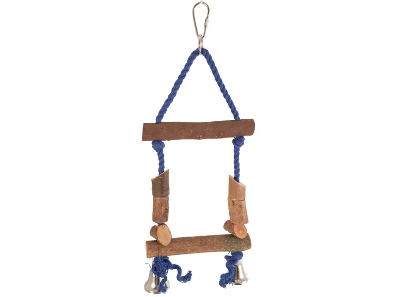 Klassisk trägunga som brukar vara en trevlig och populär leksak för de flesta småfåglar. Med bjällror som pinglar och träklossar som fågeln kan bita och picka på.