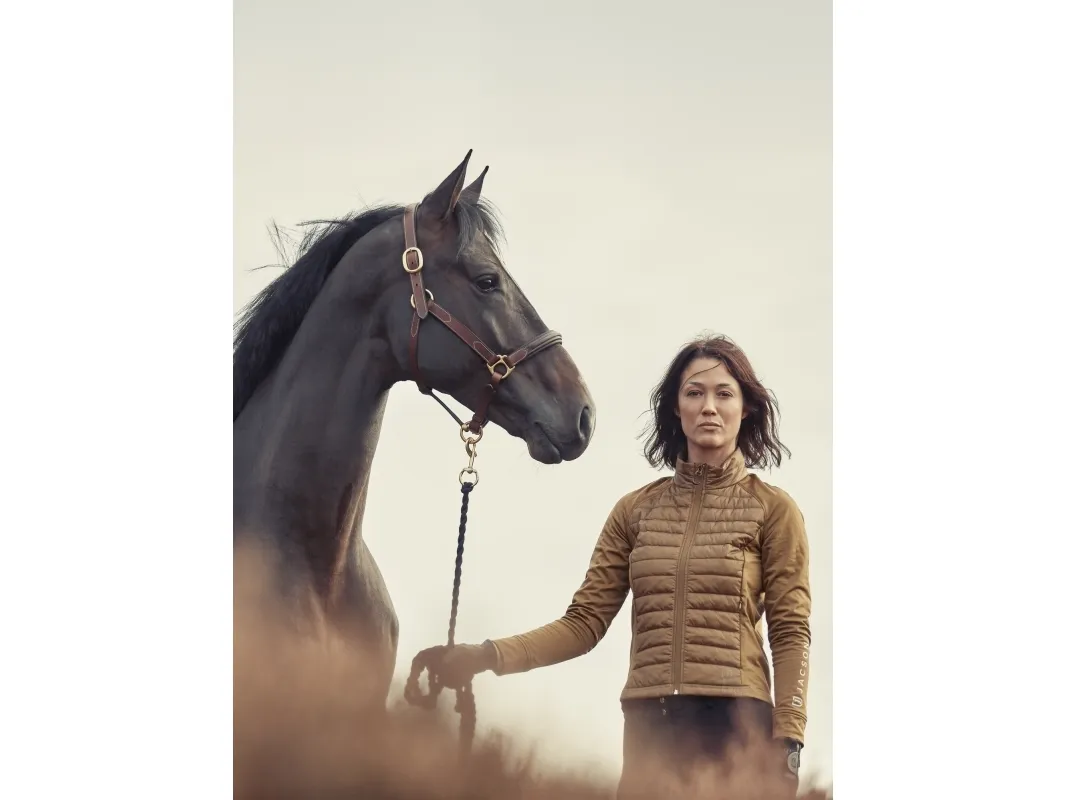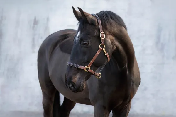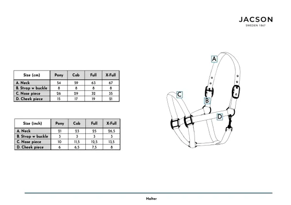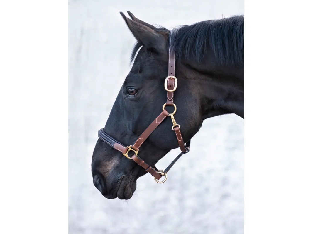 Lädergrimma i mjukt oljat vegetabiliskt läder. Mjukt foder i näsa och hals. Justerbara mässingsspännen på båda sidor om halsstycket och under näsan.