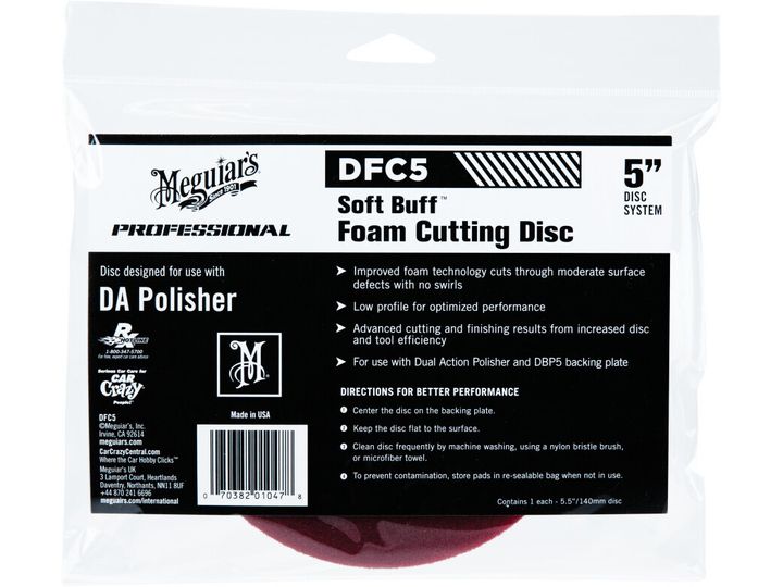 Meguiar's Foam Cutting Disc är en grov polerskiva med förbättrad skumteknik som kan skära igenom måttliga ojämnheter i lackytan utan att skapa nya virvlar. Låg profil för optimerad prestanda, med avancerad kapning och finish tack vare ökad skiv- och polermaskineffektivitet i form av Dual Action. För användning med Dual Action-polermaskiner och stödskivor med 125 mm eller 127 mm diameter som Meguiar's DBP5 Backing Disc. För bättre prestanda, se till att centrera polerskivan på stöddynan och håll polerskivan platt på ytan under poleringen. Se till att hålla polerskivan fräsch med en nylonborste, t.ex. Meguiars X1130, för att förhindra kontaminering. Efter användning kan polerrondellerna tvättas i tvättmaskin, kom ihåg att de kan förvaras i en återförslutningsbar påse när de inte används. Polerskivan är tillverkad av skum med en grov struktur för lackrengöringsmedel och föreningar. Denna polerskiva mäter 140 mm / 5,5".