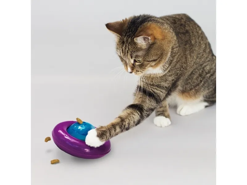 Fyll Gyron med foder eller godbitar och stimulera katten mentalt. Leksaken snurrar runt och vippar när katten försöker få tag i den. Skruva enkelt av locket för att fylla på leksaken.