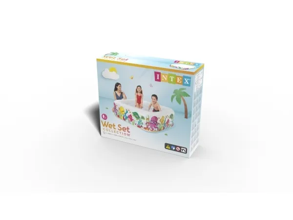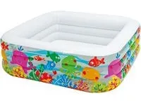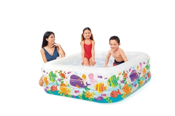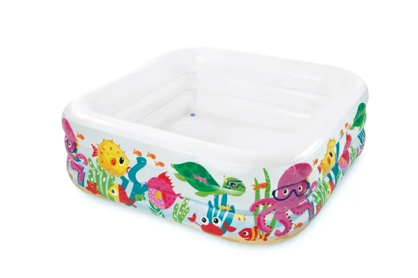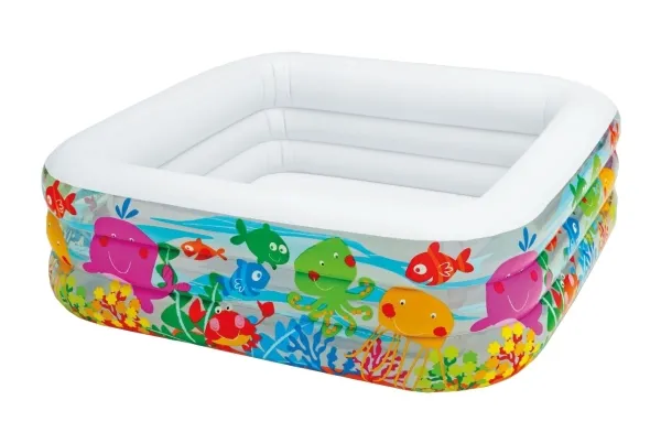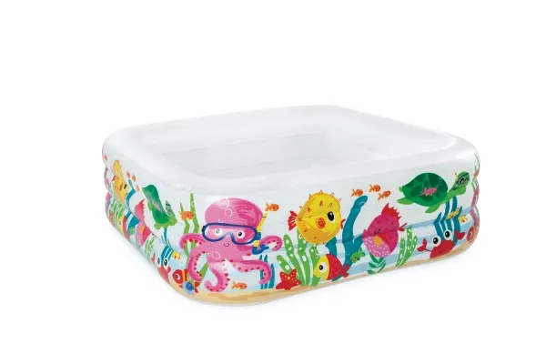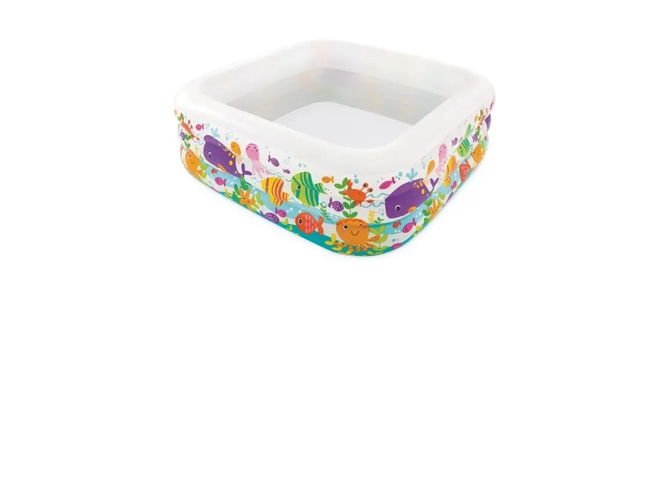 Den här poolens unika kvadratiska form gör att den är en perfekt pool att leka i. De bekväma sidoväggarna gör poolen skön att vara i och akvariedesignet med de skojiga fiskarna bidrar till en skojig undervattensupplevelse. Poolen är 159 x 159 x 50 cm när den är uppblåst och rymmer 340 liter vatten. Med avloppspropp och det ingår 1 reparationslapp. Från 3 år.