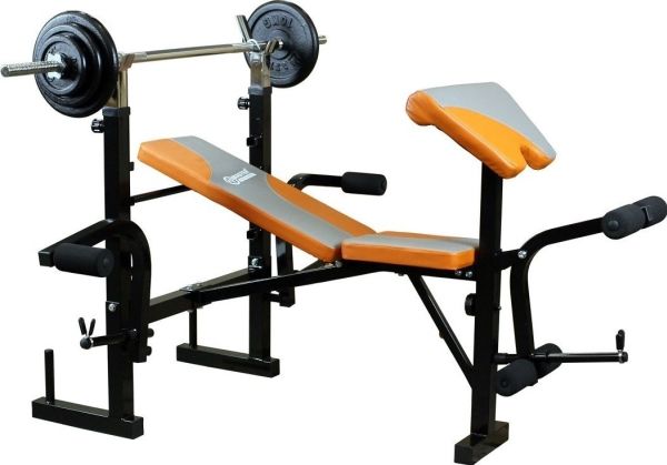 Bodybuilding-bänk under den stora skivstången MASTER Rambo 3