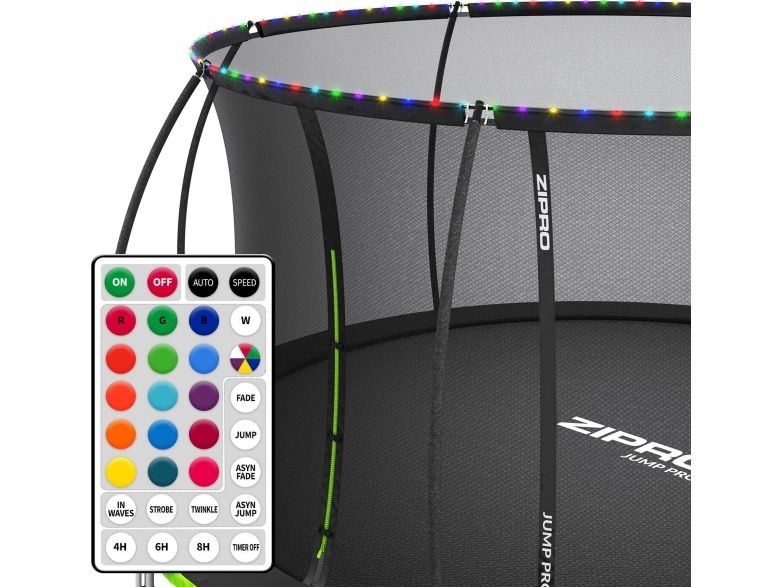 Det är värt att nämna att det erbjudna lampkitet ger ett brett urval av färger och blinklägen – och allt detta kan du bekvämt styra med den medföljande fjärrkontrollen. Totalt 17 färger, 7 blinklägen samt en timer finns till ditt förfogande, vilket definitivt ytterligare kommer att berika hoppandet på studsmattan och förlänga leken. Att sköta fjärrkontrollen är så enkelt att även ett barn kan ändra inställningarna själv. Detta ökar också deras nöje under hoppandet.