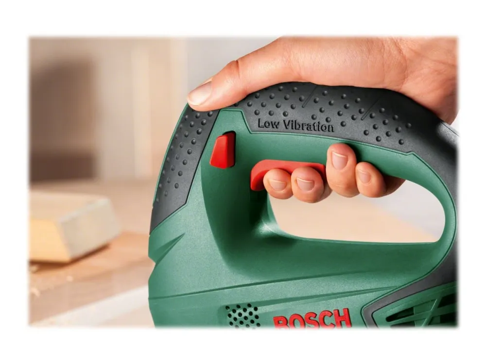 The compact size, lightweight design and superb handling of the PST 650 jigsaw provide a high level of control and user comfort. Bosch Low Vibration technology with linear mass balance and ergonomic softgrip coating guarantee maximum precision and controlled handling. The powerful 500 watt motor can cut up to depths up to 65 millimeters in wood, ensuring that even the toughest tasks can be tackled with ease.