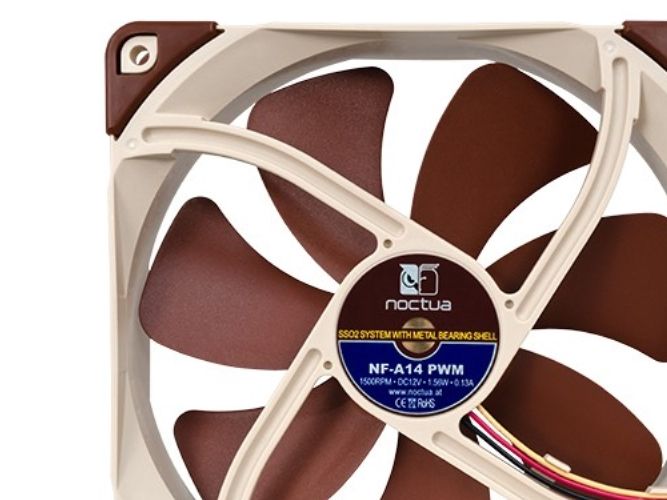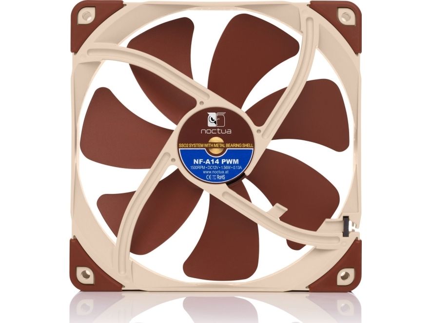 The NF-A14 is a premium quality quiet 140 mm fan with a square frame that complies with Noctua's AAO (Advanced Acoustic Optimization) standard. Its square shape and 140 mm mounting holes make it ideal for use on water-cooling radiators or as an upgrade for 140 mm case fans. Featuring sophisticated aerodynamic design measures such as flow acceleration channels, the NF-A14 further improves the renowned quiet cooling performance of the award-winning NF-P14. The PWM version sports Noctua's custom designed NE-FD1 IC for fully automatic speed control via 4-pin fan headers and comes with a low-noise-adaptor to reduce the maximum speed during PWM control from 1500 rpm to 1200 rpm. Its performance-oriented 1500 rpm top speed and comprehensive speed control options make the NF-A14 PWM an elite choice for users who strive to strike a perfect balance between excellent cooling capacity and superb quietness of operation, be it on water-cooling radiators, on heatsinks or in case ventilation.