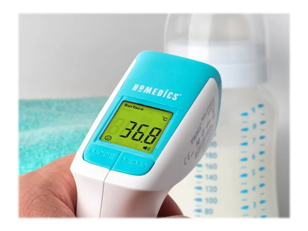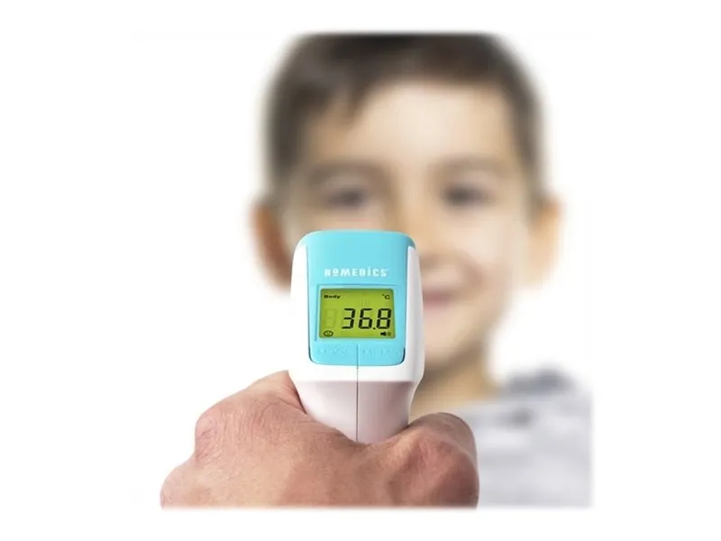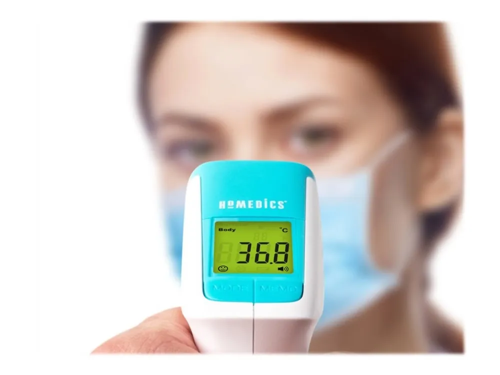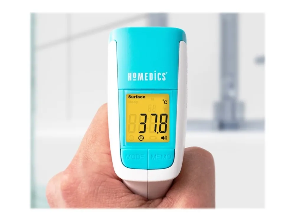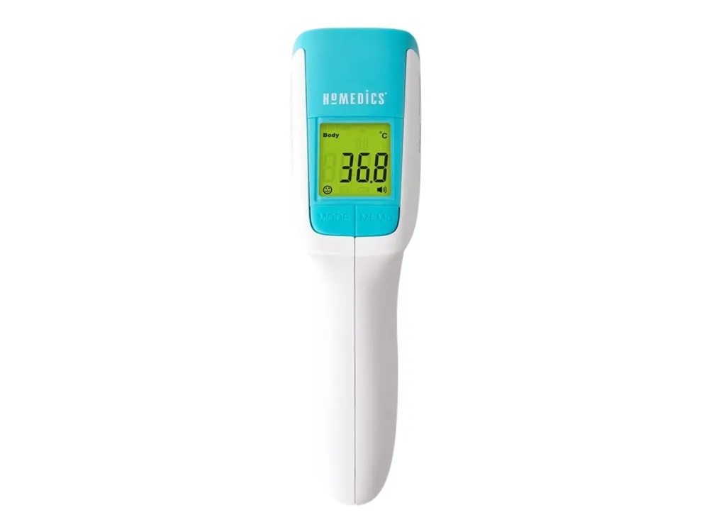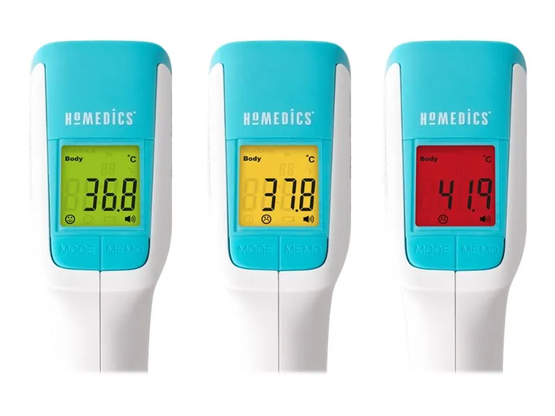 The HoMedics non-contact infrared body thermometer allows for a non-invasive and non-contact temperature reading. Simply align the thermometer with the middle of the forehead and press the scan button to take a temperature measurement.