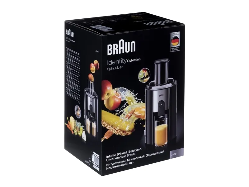 Enjoy your early-morning vitamin boost quickly and easily with the high-performance juicing system from Braun. It only takes seconds, with no cutting necessary thanks to the convenient large feeder chute, which allows you to toss in whole fruits and large chunks. The combination of foam separator and stainless steel micro-mesh sieve removes any foam and pulp, ensuring a very easy separation of foam and juice during the pouring.