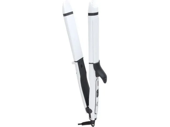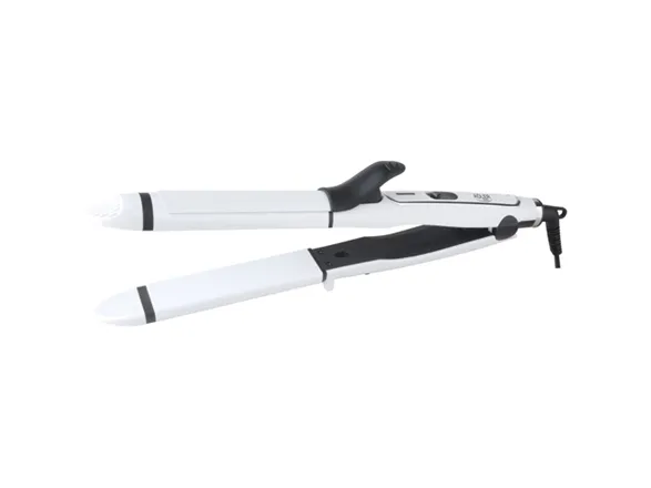 Nom. Power: 55W. Ceramic coated heating plates 30x11mm for straightening. Ceramic coated barrel ø32mm for curling. Fast heat-up PTC. Cool touch tip. 360° swivel cord. Plastic stand feet. On/off lamp. Hang-up hook. Lock button.