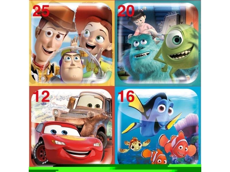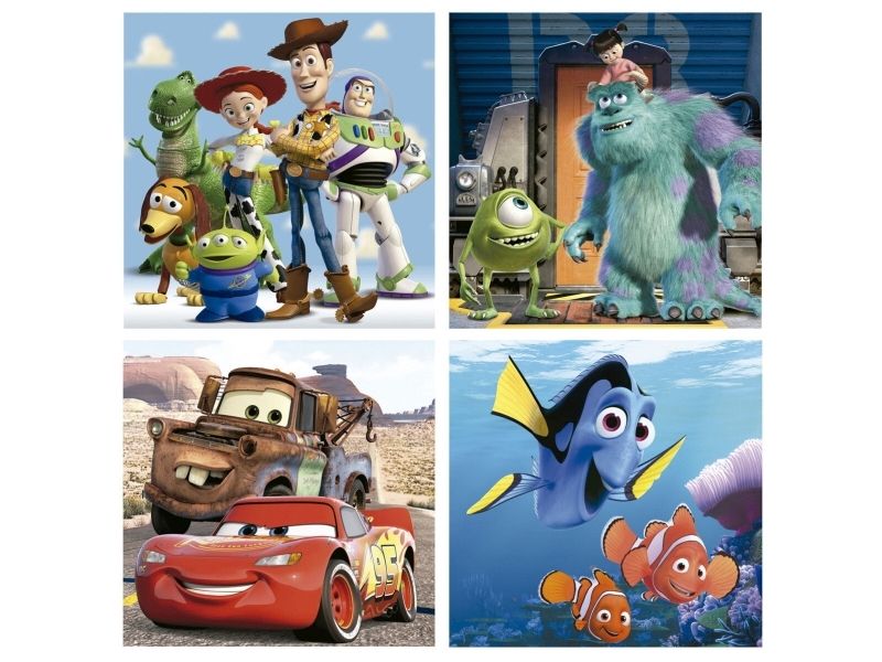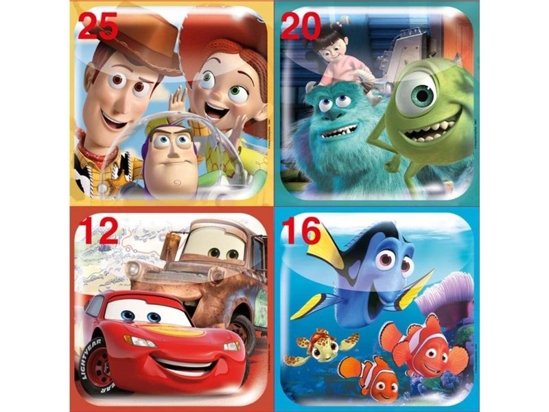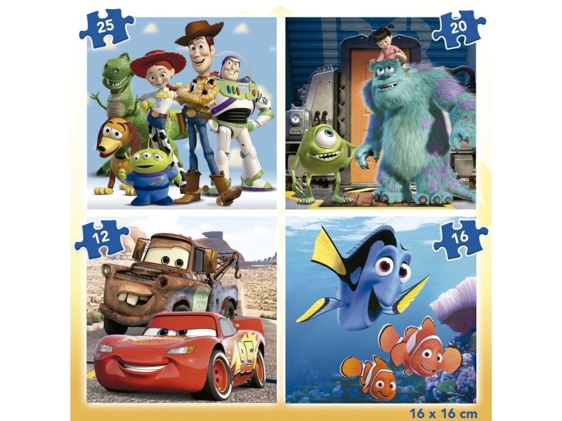 Pussel med bilder från Disney Pixar. Varje set innehåller 4 pussel med olika antal bitar (mellan 12 och 25) för barn som vill prova allt svårare pussel när de växer och lär sig lägga dem. Storleken på varje färdigt pussel: 16 x 16 cm.