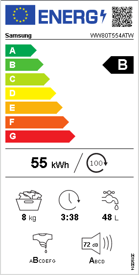 Samsung WW80T554ATW/S2, Frontmatad, 8 kg, B, 72 dB, 1400 RPM, B