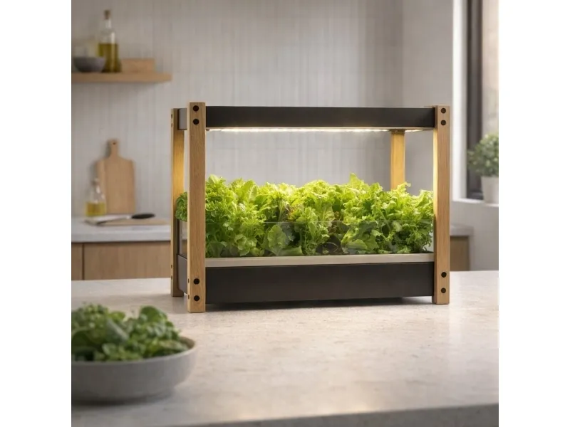 Transform your kitchen into a personal farm with the Click and Grow 25 - Black edition. This sleek and stylish system lets you cultivate a salad greens garden on your countertop. Engineered for ease and efficiency this garden enables anyone to grow fresh nutrient-rich greens without any gardening experience. With the Click and Grow 25 you'll enjoy the flavour of home-grown greens and health benefits with minimal effort.Weekly & Constant Harvest AvailabilityApp-Enabled Water & Lighting MonitoringSprouting Guarantee & Sustainable Energy UseCustomizable & High-Quality DesignNutritious Home-Grown GreensWeekly & Constant Harvest Availability The Click and Grow 25 ensures a constant supply of fresh produce at your fingertips. With a guaranteed sprouting system you can experience the joy of harvesting fresh greens every week. Say goodbye to store-bought salad mixes and hello to a continual abundance of crisp home-grown leaves for your daily meals. App-Enabled Water & Lighting Monitoring Manage your indoor garden with the touch of a button using the Click and Grow mobile app. This smart feature allows you to monitor your garden's water levels and lighting schedule effortlessly. It gives you complete control over your plants' environment ensuring that your salad greens receive the optimum care for steady and robust growth. Sprouting Guarantee & Sustainable Energy Use The Click and Grow 25's modern technology offers a sprouting guarantee ensuring that your plants will grow. The energy-efficient system also highlights sustainable living by reducing your carbon footprint through low energy consumption. Grow your leafy greens confidently with this eco-friendly garden. Customizable & High-Quality Design Our Click and Grow 25 is a masterpiece of function and form. Its high-quality natural oak and metal framework brings elegance to your living space. The modular design adapts effortlessly to your needs whether growing 25 pods or extending to hundreds creating a customizable garden that fits into any home. Nutritious Home-Grown Greens Packed with flavour and nutrition your Click and Grow 25 greens will surely be an instant hit on your plate. Growing your greens ensures you're getting the freshest produce without harmful additives straight from your indoor garden to your table. Start enjoying the countless health benefits that come with home-grown greens today. Package IncludesClick and Grow 25 in black with a stylish natural oak and metal frame with wooden legs and panels - DarkSmart app-controlled grow lights and an integrated humidity sensorA bumper 54x pod pack to kick-start your garden including an assortment of salad greens: Leaf Mustard (9x) Red Kale (9x) Romaine Lettuce (18x) and Green Lettuce (18x)Manual and tools for easy assemblyPower adapter2x LED grow lights1x 9 litre / 3.37-gallon water tank and sliding base for the water tank6x Grow Flow? trays for plant pods1x Grow Flow? tray holderTray cover for faster germinationProduct SpecificationsColour: DarkEach module has six trays: 1 for harvesting or storing the herbs you plan to harvest and 5 to always have in the garden to produce new greens.Measurements: W: 75.5 cm x H: 51 cm x D: 43 cmFloor area: 3.2 sq ft | 0.3 m².Plant capacity: 25 plants per 1 moduleFive trays per module five plants in each tray (5x5)Vertically stackable; 3 modules maxTwo finishes/colours available - choose between oak wood + white panels or oak wood + black panels