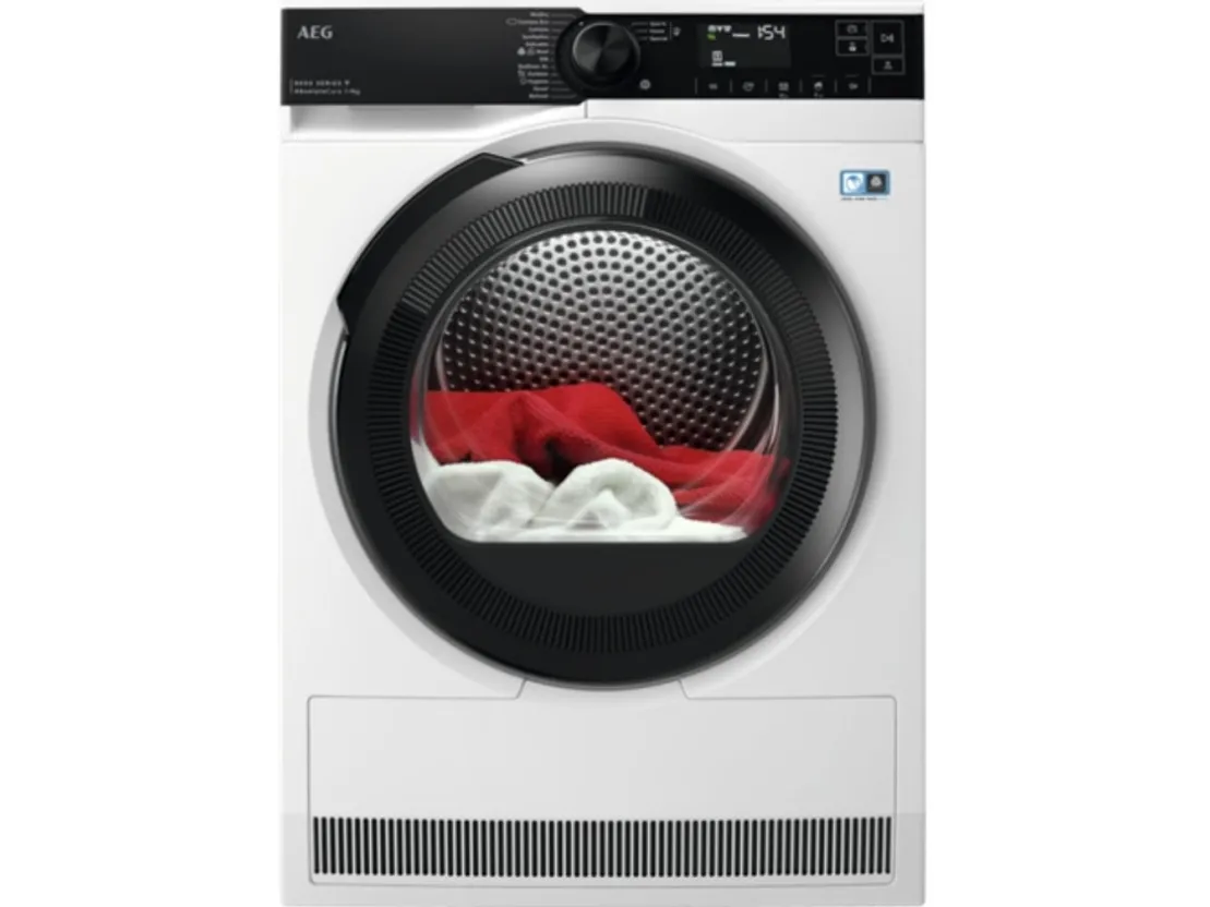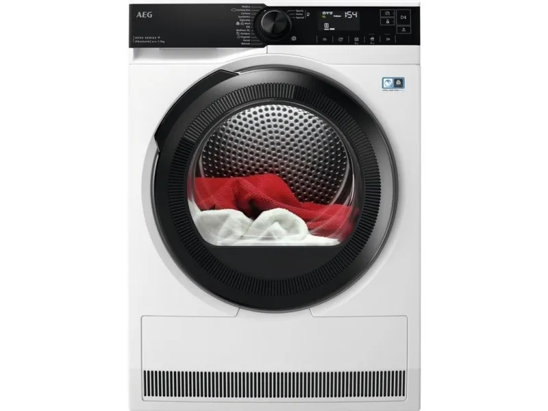 Brand- AEG. Model- 8000 serija „AbsoluteCare®“ TR839P4CE. Width- 59.6 cm. Depth- 638 cm. Height- 85 cm. Colour- White. Weight- 51.5 kg. Drum capacity- 9 kg. Energy Efficiency Class- D. Type of drying- Condensing with heat pump. Drying efficiency class- C. Number of applications- 12. Noise level- 64 - 64dB. Control- Sensoric, Electronic, By smartphone. Screen- Yes. Postponement of the start of the program- Yes. Mandatory warranty- 24 mo.