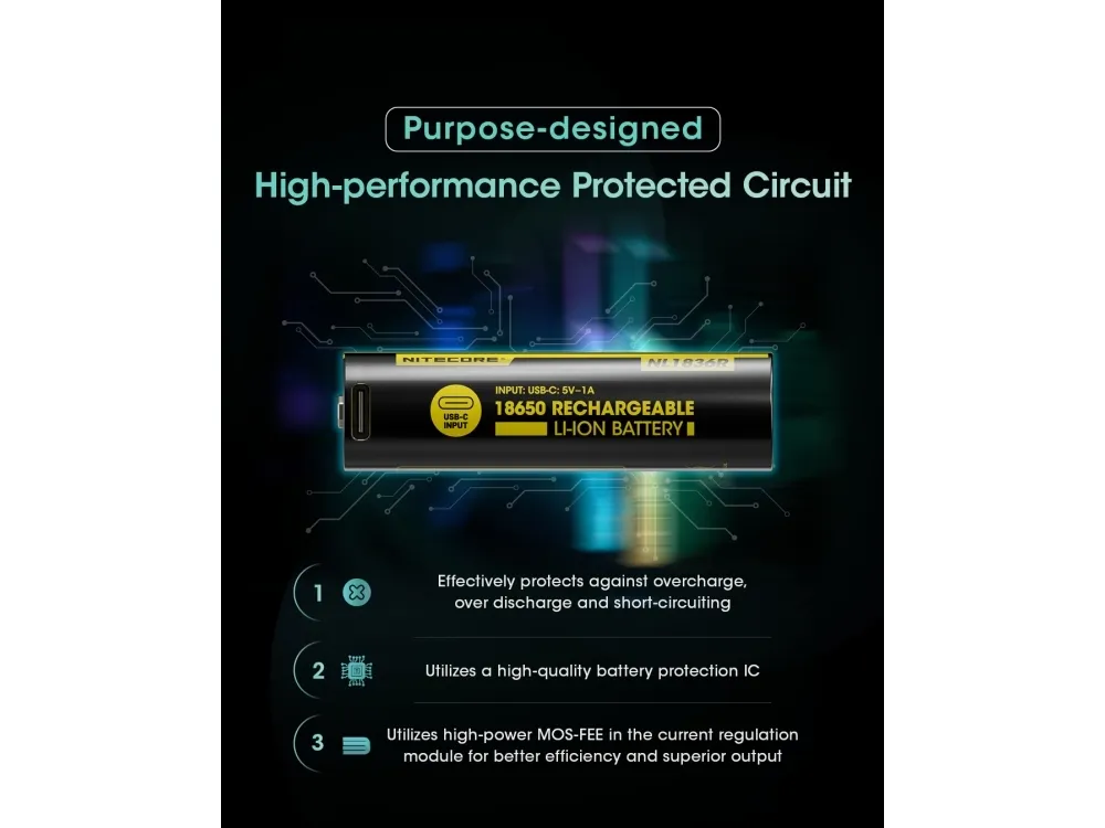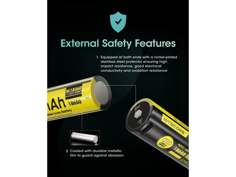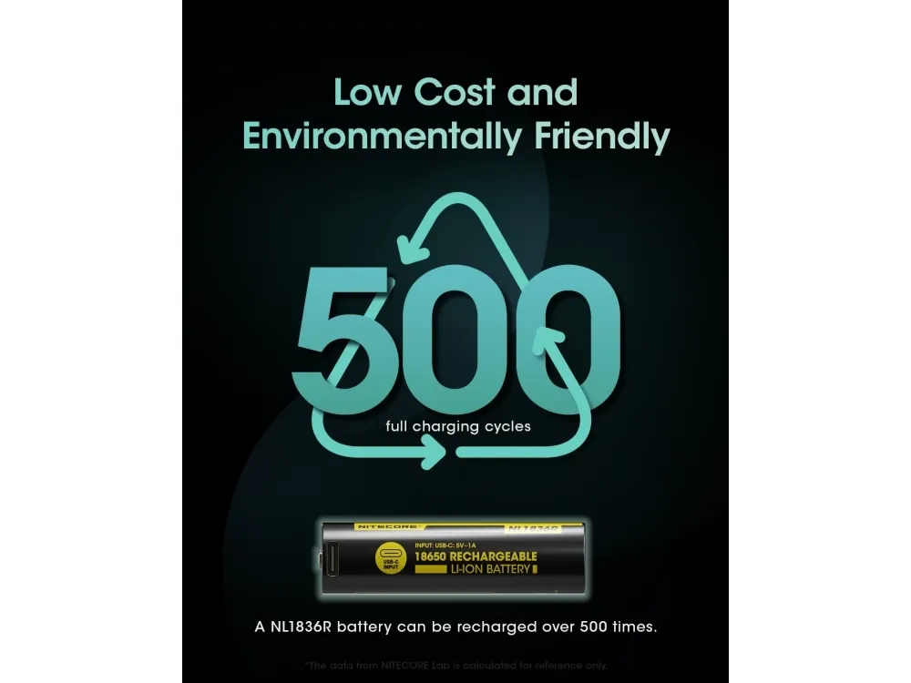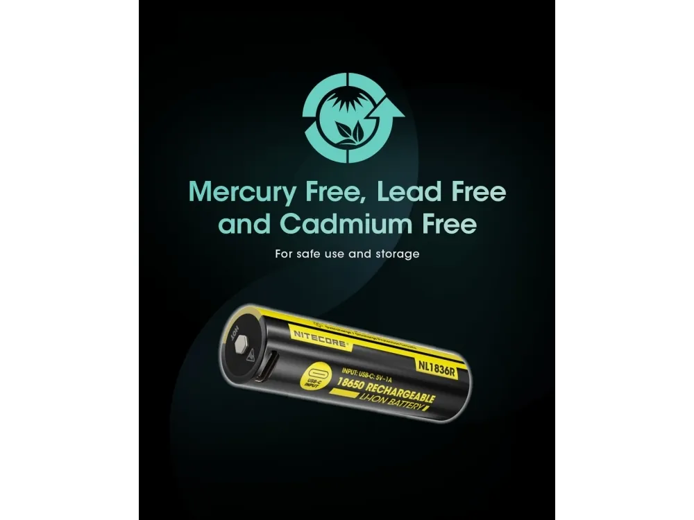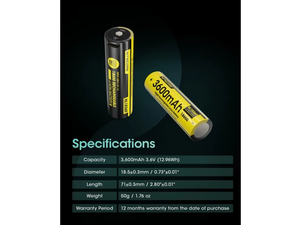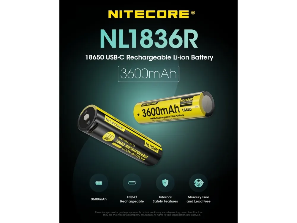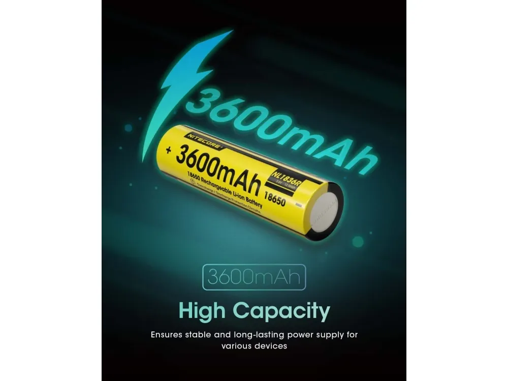 Nitecore NL1836R. Number of batteries included: 1 pc(s). Battery capacity: 3600 mAh, Battery capacity: 12.96 Wh, Battery technology: Lithium-Ion (Li-Ion), Battery voltage: 3.6 V