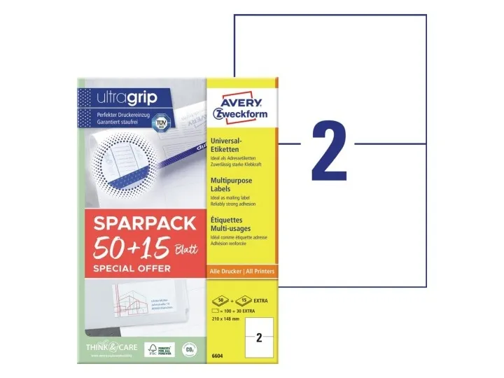 Har du flere forskellige typer printere på kontoret? Intet problem, du behøver kun købe én slags etiketter, for med Avery’s hvide 6604 Universaletiketter med Ultragrip til indendørsbrug med 2 etiketter/ark og 130 etiketter/pk, får du etiketter der kan bruges til både s/h- og farvelaserprintere, inkjetprintere samt kopimaskiner. Så behøver du ikke længere bekymre dig om du har lagt etiketterne til Inkjetprinteren i Laserprinteren.