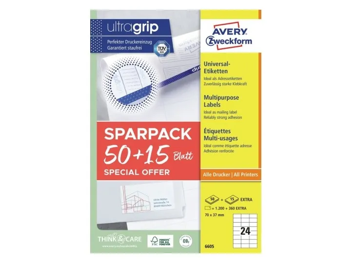 Universaletiketter Avery 70x37 mm, hvid med Ultragrip + 30% ekstra indhold - (65 ark x 24 stk.)