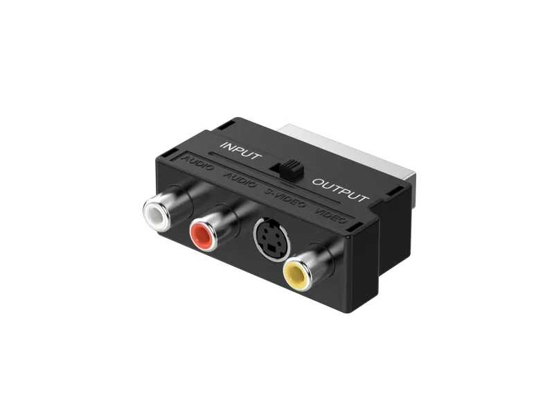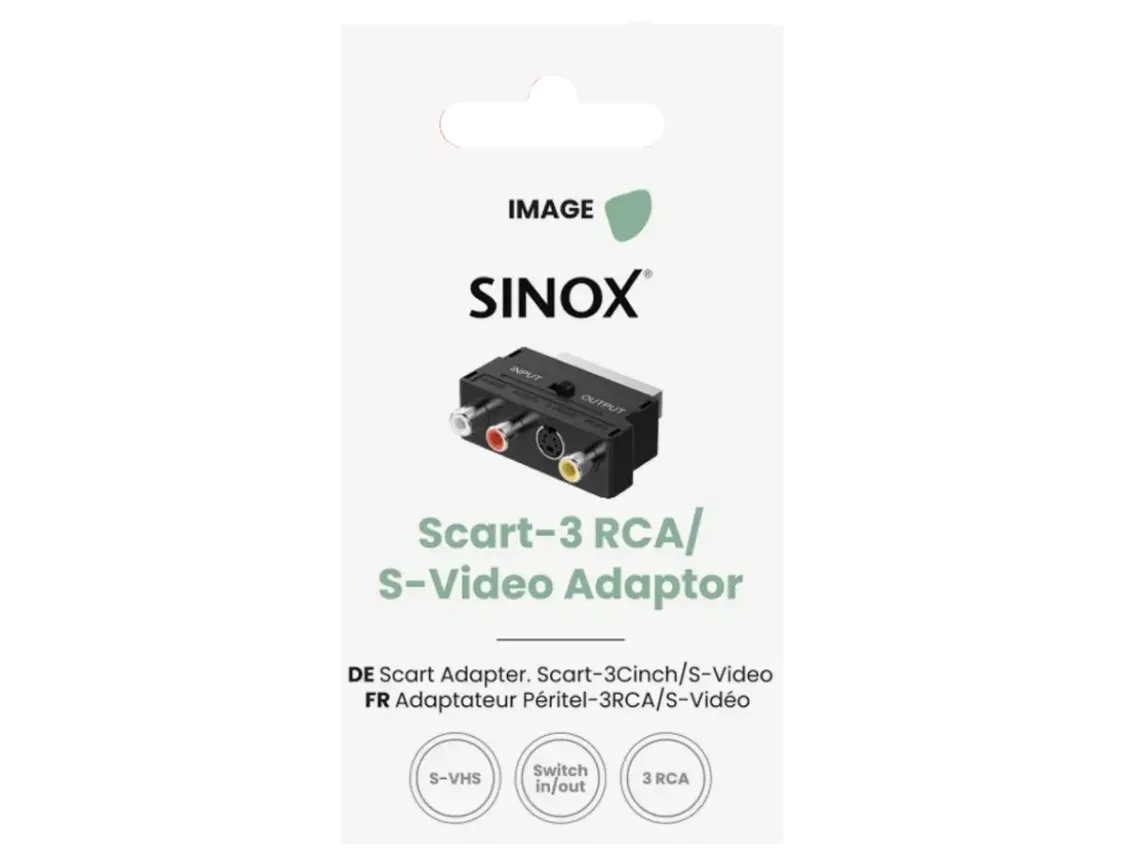 Sinox Scart til Composit adapter kan bruges til at overføre analoge audio- og videosignaler. Denne er med omskifter.