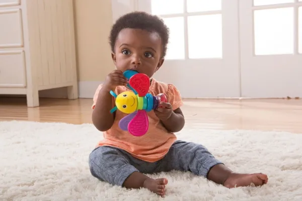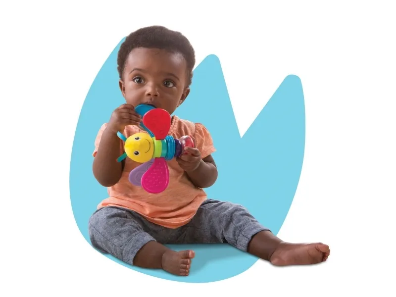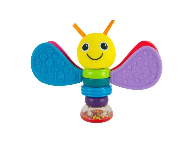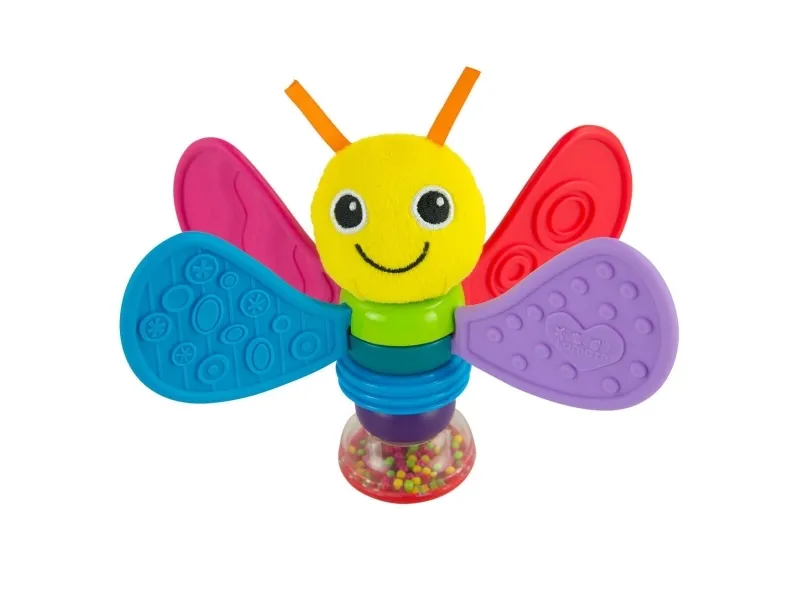 The gorgeous Lamaze Freddie the Firefly Rattle is ready for baby’s every adventure. Full of bright colours and multiple textures, the rattle is easy to hold and explore. Freddie’s spinning wings are perfect for teething babies. Shake the rattle slowly and smoothly to help baby focus on a moving object and on the colourful beads in the see-through pod.