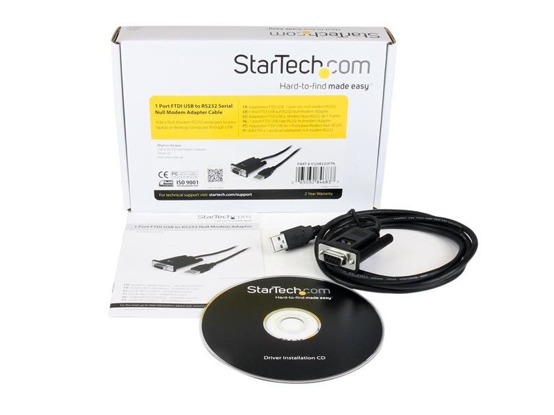 Den ICUSB232FTN seriella kabeladaptern (1 port) för anslutning mellan FTDI USB och nollmodem konverterar en tillgänglig USB 1.1- eller 2.0-port till en seriell RS232 DB9 nollmodemsport som löser DCE/DTE-konflikter direkt utan att behöva ansluta extra korsade seriella kablar eller adaptrar.