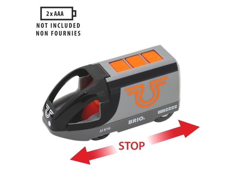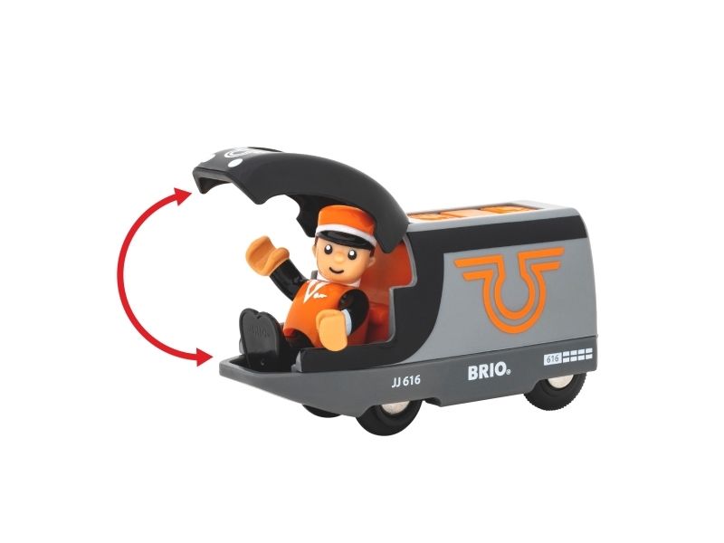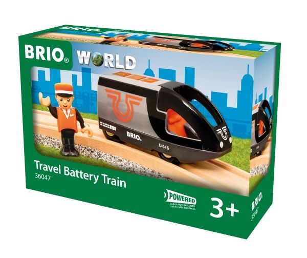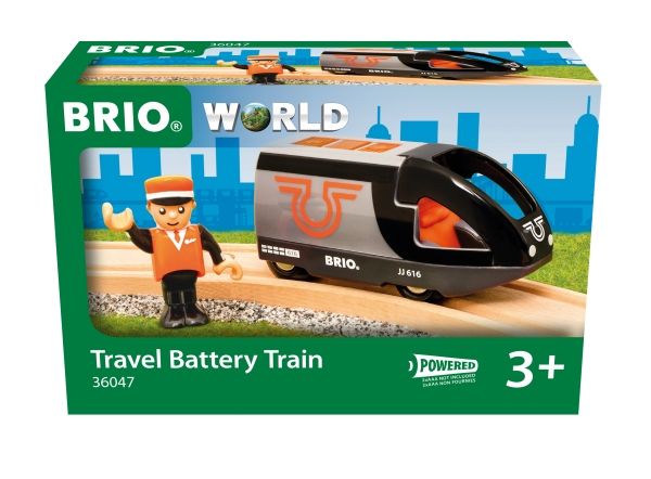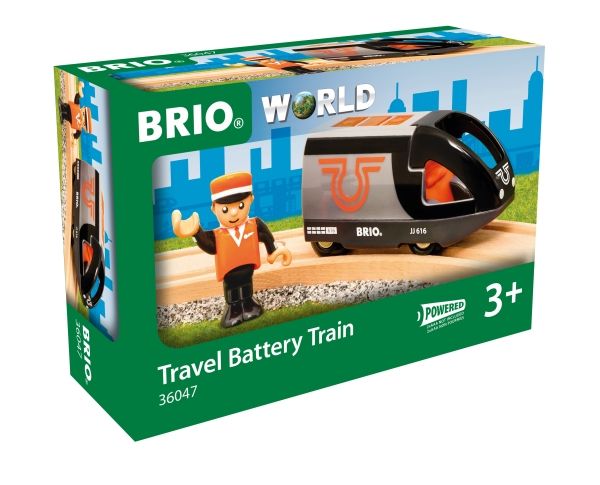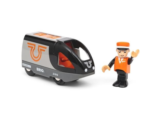Res runt i din BRIO World ombord 36047 Batteridrivet passagerartåg. Det moderna svart/orange loket är batteridrivet med användarvänliga knappar på tågtaket. Kör framåt, bakåt och stanna enkelt – tåget går alltid i tid. Det finns även utrymme för tågföraren.
