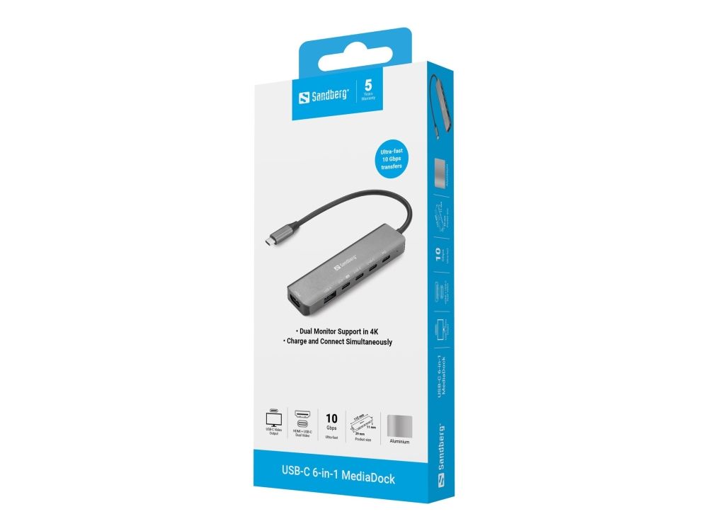 Sandberg USB-C 6-in-1 MediaDock expands your laptop with all the essential connections from a single USB-C port. You get both HDMI and an extra USB-C port with video output, allowing you to connect two external monitors simultaneously in stunning quality up to 4K@60Hz. At the same time, you can charge your device with up to 100W Power Delivery and transfer data super fast via USB-A and USB-C ports with up to 10 Gbps. Housed in a compact aluminum casing, it's handy for work, study, and travel.