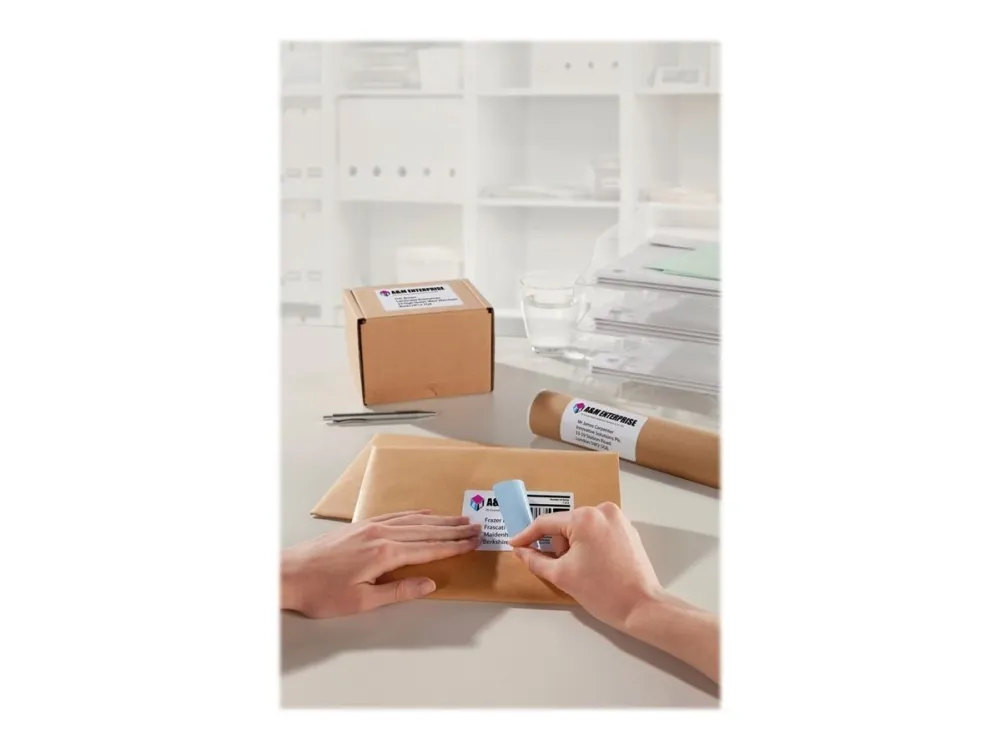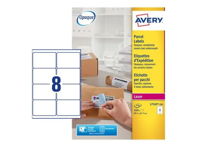 Ge dina paket och brev ett professionellt utseende genom med dessa helvita, 100 % täckande paketetiketter. Avery L7165-100 med BlockOut har 8 etiketter/ark och 800 etiketter/förpackning.