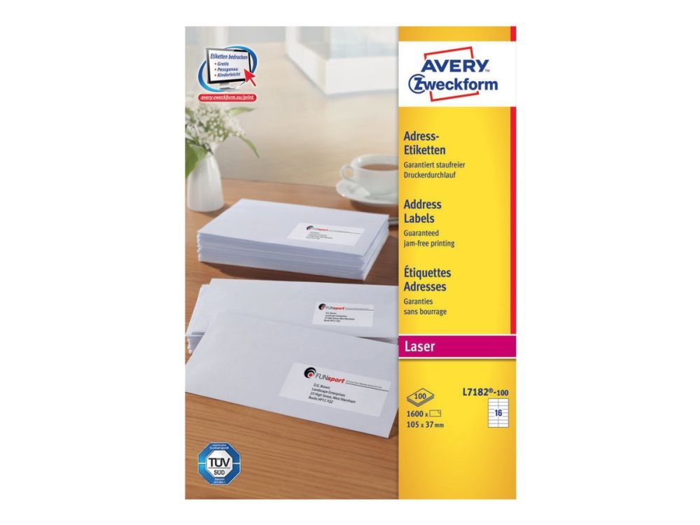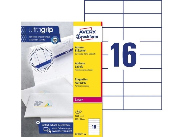 Etiketterna är lämpliga som adressetiketter för brev, paket och försändelserör i alla storlekar. Averys vita L7182-100 etiketter med 16 etiketter/ark och 1 600 etiketter/förpackning är det idealiska valet för den som skickar stora mängder post. Denna förpackning med 100 ark är perfekt för stora etikettuppgifter.