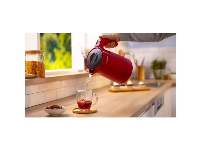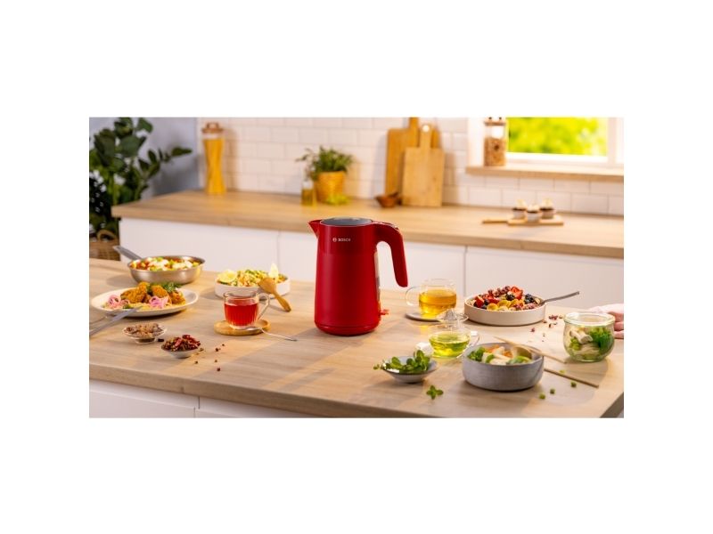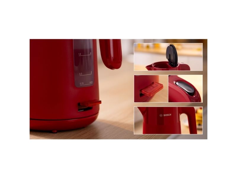 The Bosch MyMoment TWK2M164 kettle combines functionality with safety, making it an essential appliance for any kitchen. With a 1.7-liter capacity, it's perfectly suited for preparing hot beverages for families or gatherings. The kettle features a 360-degree connector base and cordless pouring, which together provide convenience in use and handling. Safety is a priority with the inclusion of boil-dry protection and overheat protection, ensuring the kettle operates safely under all conditions. Additionally, the concealed heating element not only facilitates easy cleaning but also ensures efficient boiling. The kettle's design is complemented by a BPA-free plastic body, emphasizing health and environmental consciousness. With these features, the Bosch MyMoment kettle stands out as a reliable and user-friendly choice for those who value both safety and convenience.
