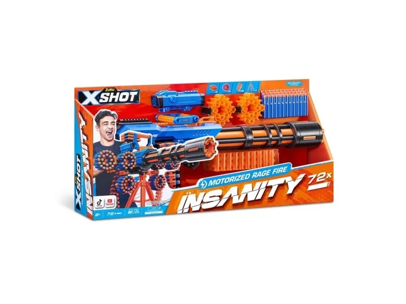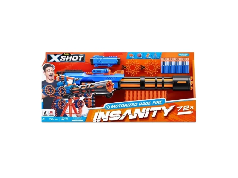 Insane combos, ammo and action with XSHOT Insanity! The XSHOT Insanity Motorized Rage Fire is the biggest and most insane blaster in the Insanity Range! The Motorized Rage Fire is so big it comes equipped with a tripod. Load up its 40 dart auto feeding belt to take out multiple targets from up to 27m / 90 feet away in seconds! Plus it comes with an insane amount of accessories and dart storage to hold an additional 46 darts to keep you locked and loaded in battle. XSHOT darts include Air Pocket Technology for a faster, further, and more accurate blast. Combine the Motorized Rage Fire with other Insanity blasters to make the most insane blaster!XSHOT Insanity Motorized Rage Fire (72 Darts). Product type: Toy blaster, Recommended age (min): 8 yr(s), Recommended age (max): 99 yr(s), Product colour: Multicolour, Shooting power: 27 m. Weight: 2.98 kg
