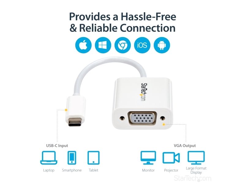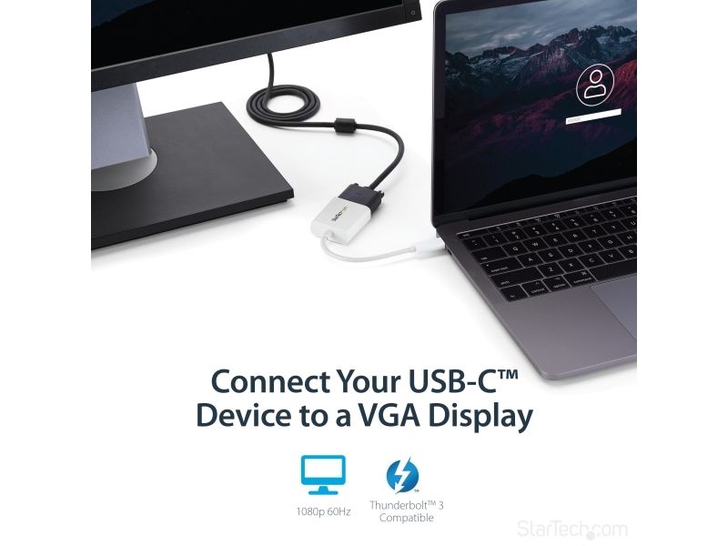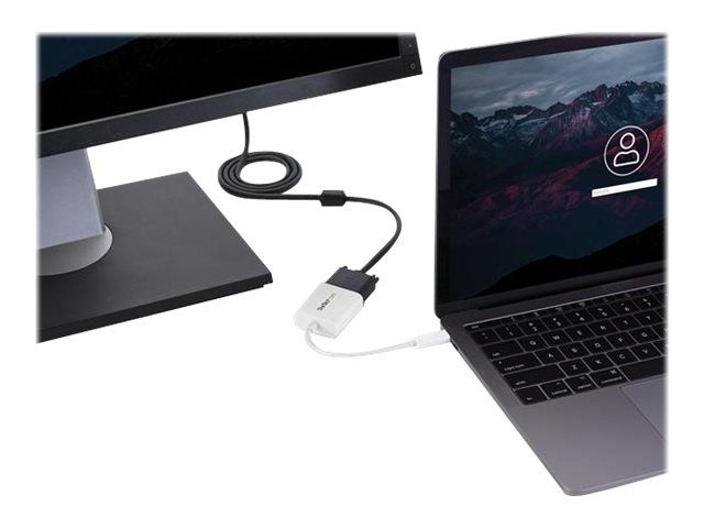 StarTech USB-C- till VGA-adapter - vit - USB/VGA-adapter - USB-C (hane) till HD-15 (VGA) (hona) - USB 3.1 Gen 1 / Thunderbolt 3 - 17.5 m - USB-ström, 1920 x 1200 (WUXGA) stöd - vit - för P/N: TB3DK2DPPD, TB3DK2DPPDUE, TB3DK2DPW, TB3DK2DPWUE, TB3DKDPMAW, TB3DKDPMAWUE