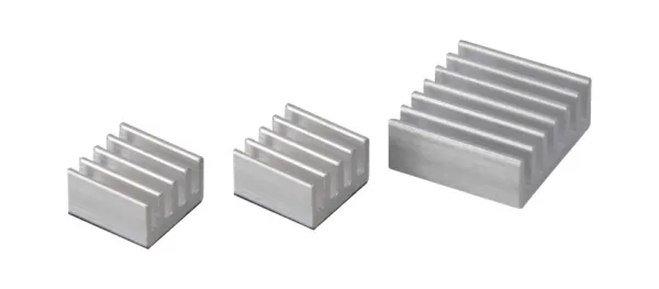 This heat sink set for the Raspberry Pi A, B, B+, model 2, Banana Pi, pcDuino and other single-board computers consists of 3 adhesive heat sinks. That way you can protect your device perfectly for high temperature conditions or if your CPU is overclocked for thermal issues.
