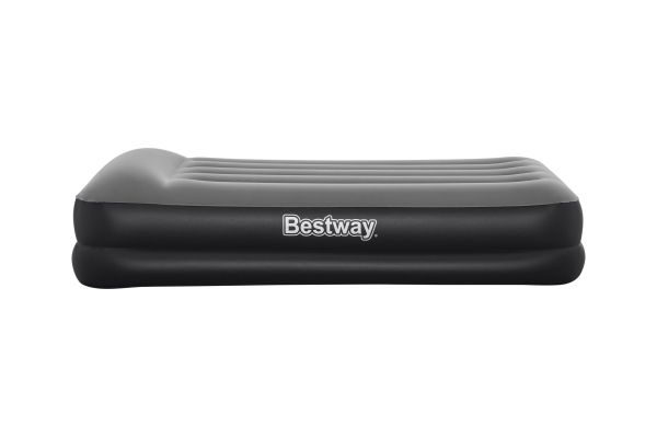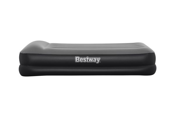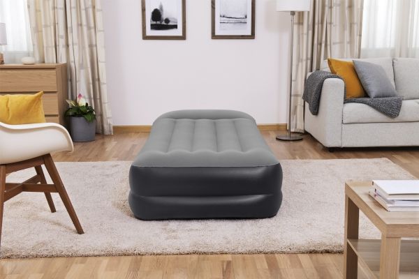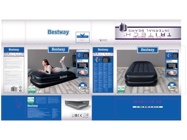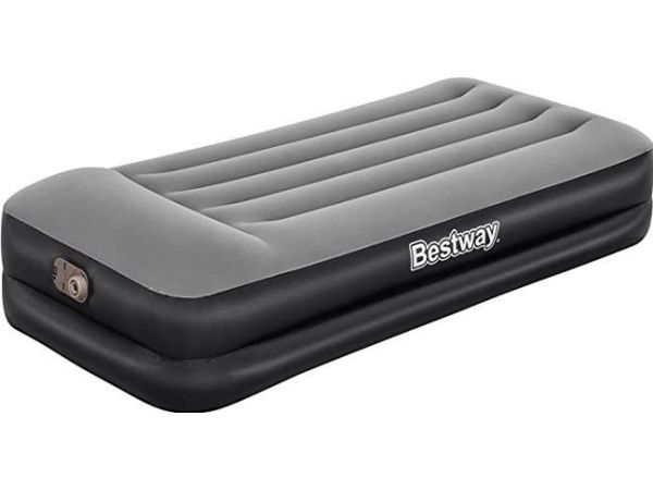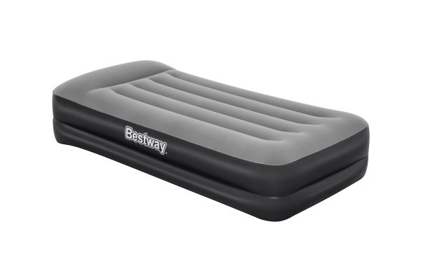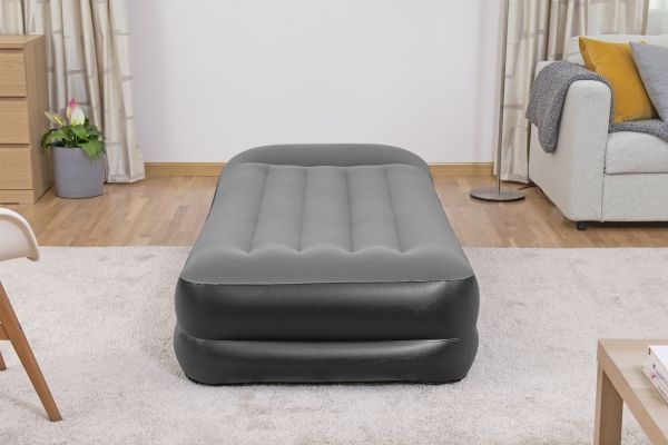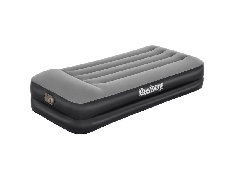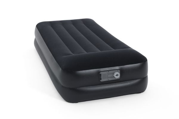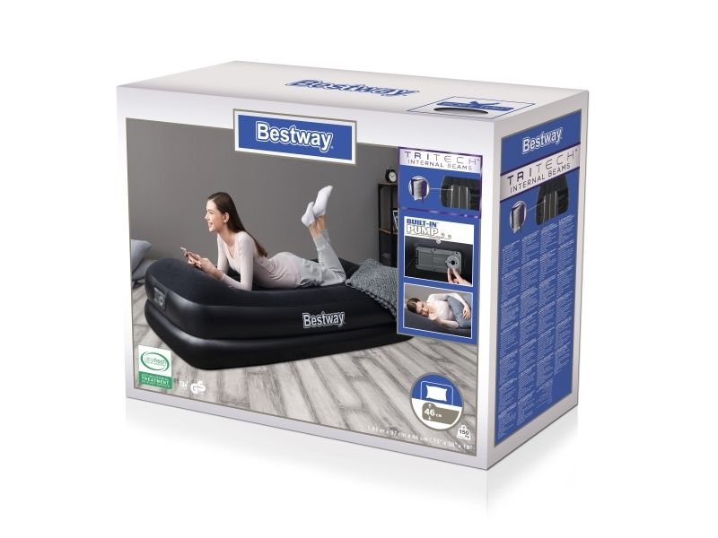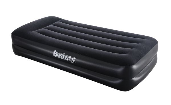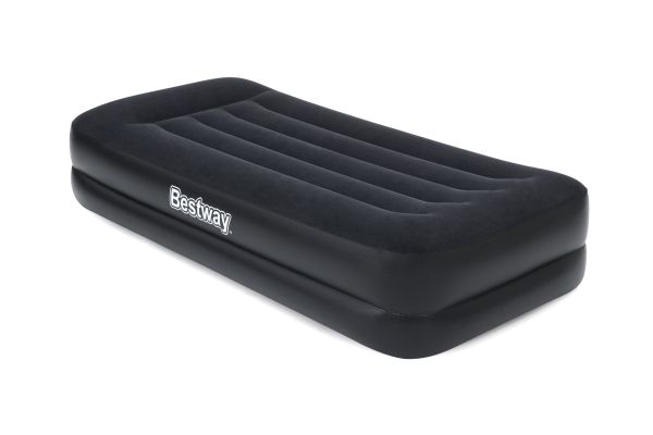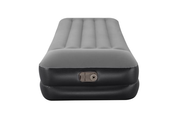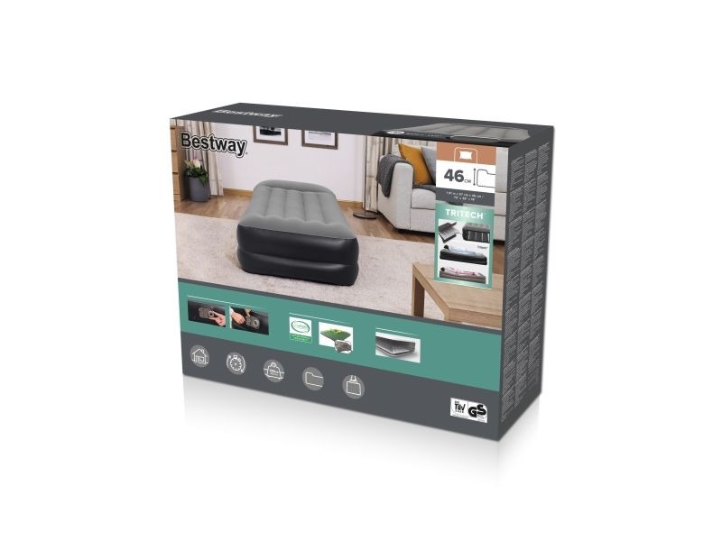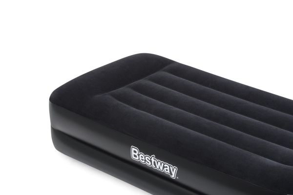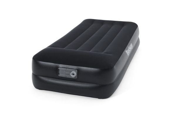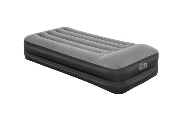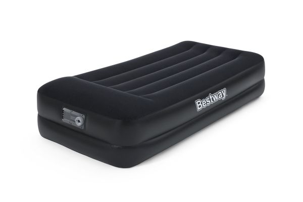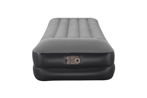 PREMIUM+ AIR BED / SINGLE - Safety valve - Sturdy pre-tested vinyl - Built-in pillow - Comfortable flocked sleeping surface - Sturdy I-beam construction - Built-in 220-240V~electric air pump TUV approved) - Inflates in 180 seconds - Great for indoor use - Travel bag included - Heavy-duty repair patch included Content: One air bed, one travel bag, repair patch