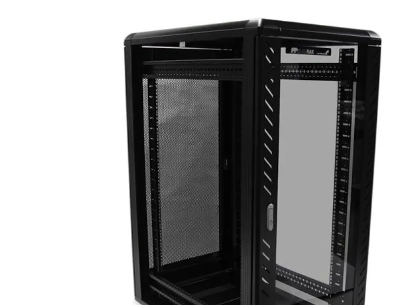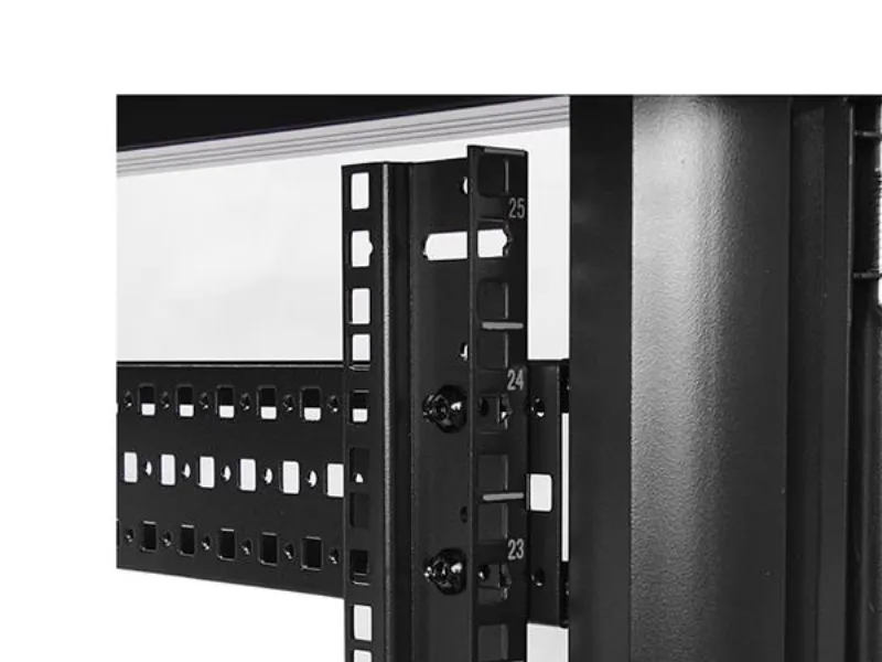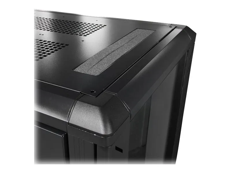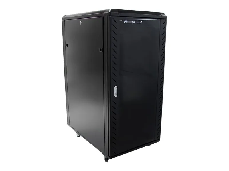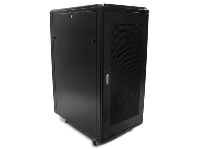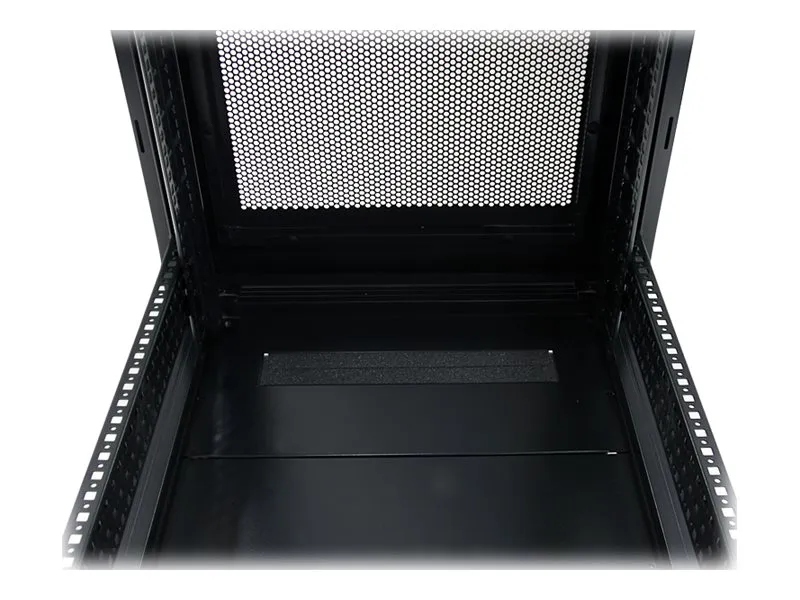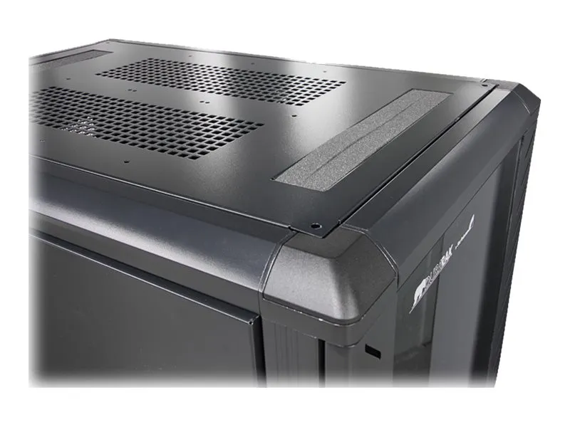 Serverhyllan har 25U förvaringsutrymme i ett slimmat och säkert skåp för förvaring av EIA-310-kompatibla 19" hyllmonterbar utrustning som till exempel Dell-, HP- och IBM-servrar tillsammans med telekommunikations- och A/V-utrustning. Hyllan är en robust förvaringslösning som stöder upp till totalt 800 kg. Problemfri utrustningsinstallation Hyllan är designad med olika funktioner som gör att du enkelt kan inkorporera mycket utrustning. Med justerbara monteringsskenor kan du enkelt ändra skendjupet till upp till 1000 mm. Dessa skenor garanterar att skåpet har brett stöd för din hyllmonterbara standardutrustning. Det extra djupet ger också stöd för extra kabel- och strömhantering bakom utrustningen. Hyllan har borstportar på tak- och golvpanelerna så att du enkelt kan dra kablar till insidan och utsidan av skåpet för diskret kabelhantering. Golv- och takpanelerna kan dessutom tas bort så att du kan anpassa din uppställning. Hyllan har jordningskontakter så att du kan jorda din utrustning för extra skydd. Skydda din utrustning samtidigt som du kan se den För att garantera full synlighet av din utrustning samtidigt som den är inlåst har hyllan ett elegant glasfönster på framdörren. Glasdörren passar bra i alla serverrum och ger dig friheten att enkelt övervaka utrustningen utan att behöva öppna hyllan. Hyllan har dessutom löstagbara sidopaneler med oberoende lås- och snabbutlösningsmekanismer så att du får enkel åtkomst till din utrustning samtidigt som den är säker. Spara pengar med en kostnadseffektiv och kompakt transportförpackning Skåpet levereras i ett platt paket för att reducera fraktvolymen vilket reducerar dina fraktkostnader signifikant. Och eftersom hyllan är effektivt packad kan du enkelt förvara skåpet för senare användning. Maximal manövrerbarhet med medföljande hjul Skåpet har hjul för problemfri åtkomst till utrustning monterad på baksidan och enkel rörlighet runt omkring i kontoret, studion eller serverrummet. Bredden och höjden på hyllan får dessutom plats genom standard dörröppningar så att du kan rulla serverhyllan till olika rum. Garantera att din utrustning har optimal temperatur Hyllans bakdörr har nät och glasdörren på framsidan är ventilerad och tillsammans arbetar de för att öka luftflödet och ge passiv kylning som är kostnadseffektiv och ser till att din utrustning har optimal temperatur. Takpanelen har fyrkantiga ventileringshål som är kompatibla med korgmuttrar, vilket ger monteringspunkter så att du kan lägga till extra utrustning ovanpå hyllan. Takpanelen har dessutom fläktmonteringar som ger dig friheten att lägga till fläktar för utrustning som kräver aktiv kylning.