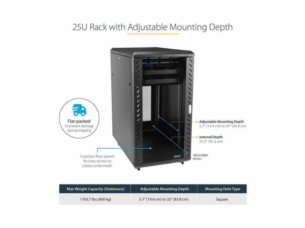 StarTech.com 25U Network Rack Cabinet on Wheels - 36in Deep - Portable 19in 4 Post Network Rack Enclosure for Data & IT Computer Equipment w/ Casters (RK2536BKF) - rack - 25U