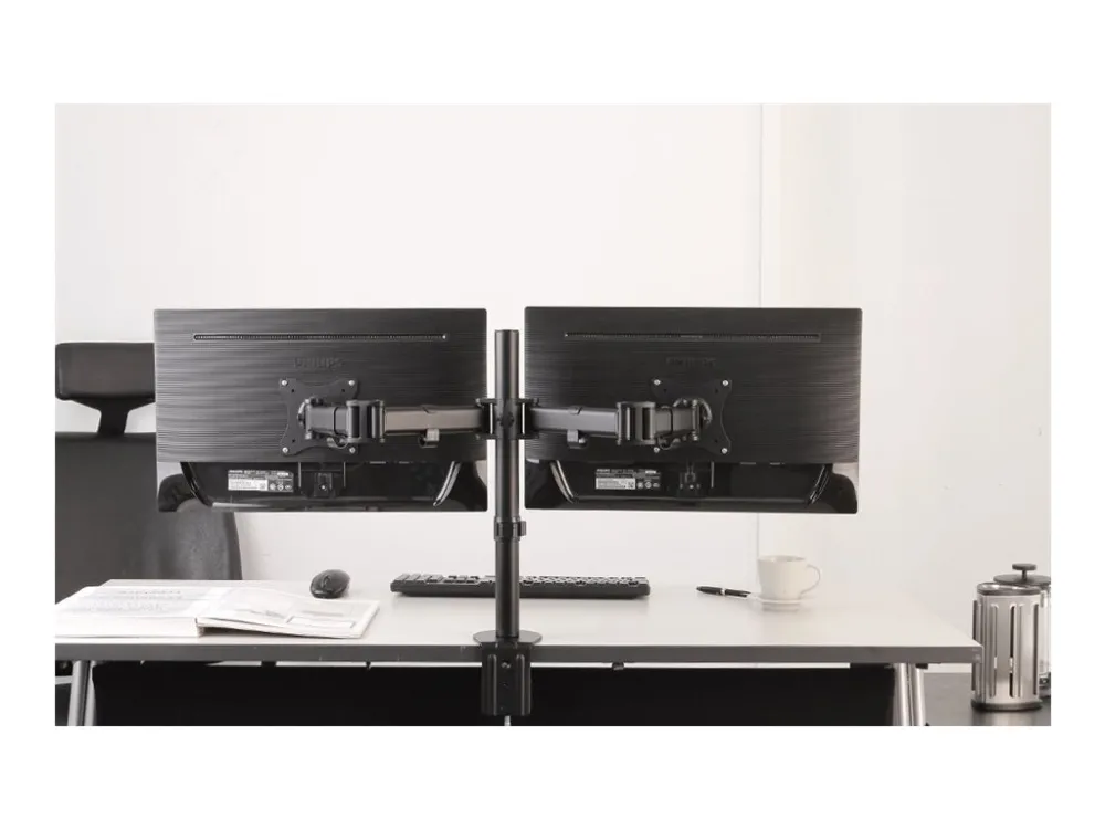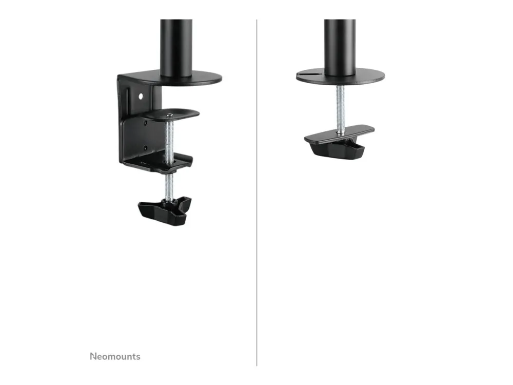 The Neomounts desk mount, model NM-D135DBLACK is a tilt, swivel and rotatable desk mount for 2 flat screens up to 27". This mount is a great choice for space saving placement on desks using a desk clamp or grommet mount. Neomounts versatile tilt (90°), rotate (360°) and swivel (180°) technology allows the mount to change to any viewing angle to fully benefit from the capabilities of the flat screen. The mount is manually height-adjustable from 0 to 41.5 centimeters. Depth-adjustable from 0 to 42.7 centimeters. An innovative cable management conceals and routes cables from mount to flat screen. Hide your cables to keep the workplace nice and tidy. Neomounts NM-D135DBLACK has three pivot points and is suitable for screens up to 27" (69cm). The weight capacity of this product is 8kg each screen. The desk mount is suitable for screens that meet VESA hole pattern 75x75 or 100x100mm. Different hole patterns can be covered using Neomounts VESA adapter plates. By using an ergonomic mount neck and back complaints can be avoided. Ideal for use in offices and on counters or in a reception area. All installation material is included with the product.