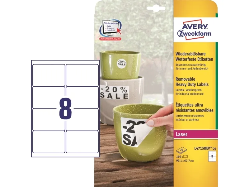 Etiketter, Avery L4715REV-20, 99,1 x 67,7 mm, 8 pr. ark, 20 ark