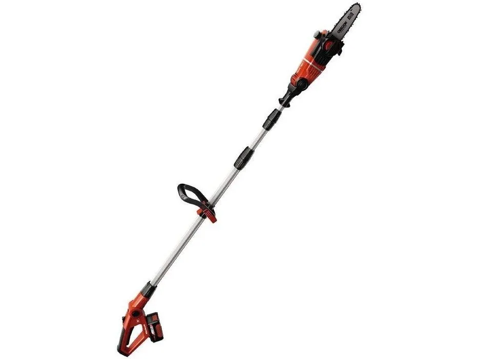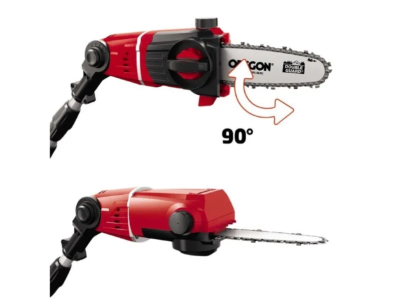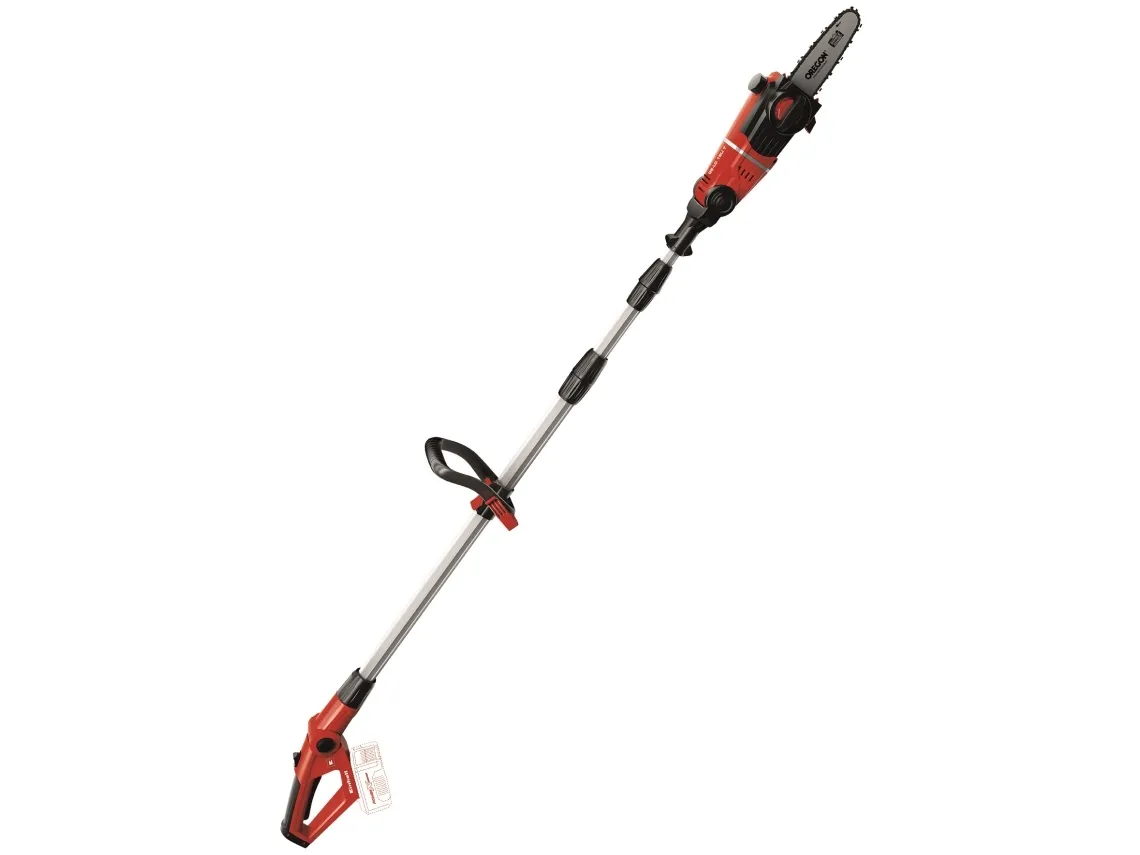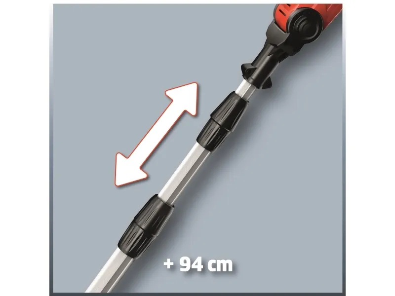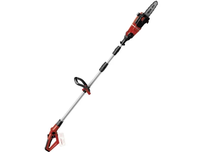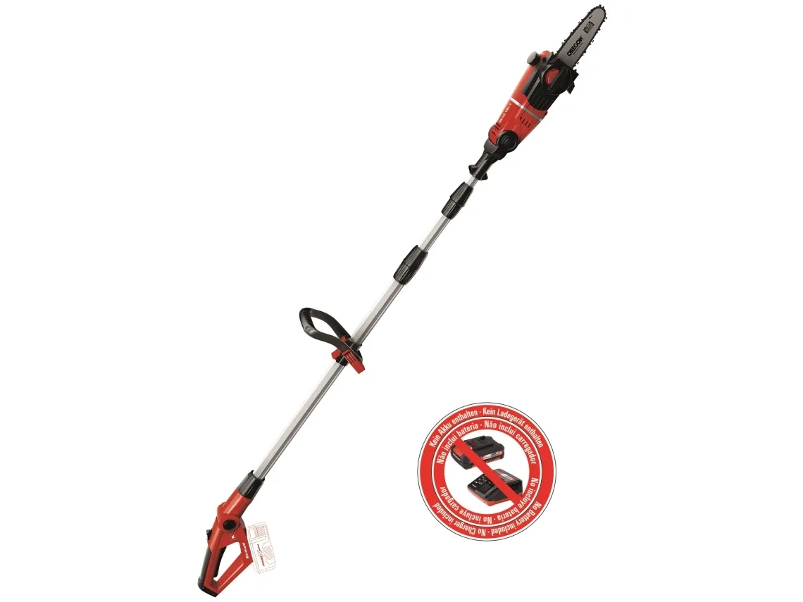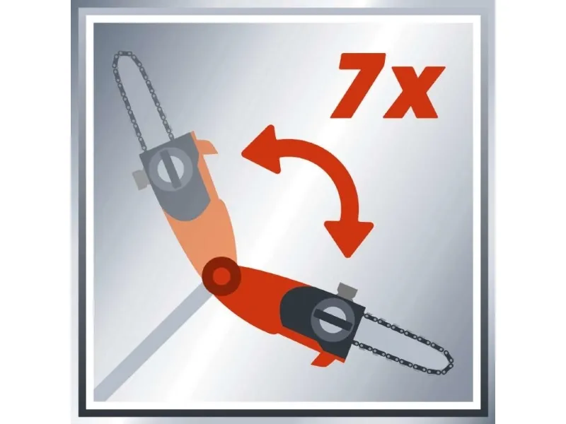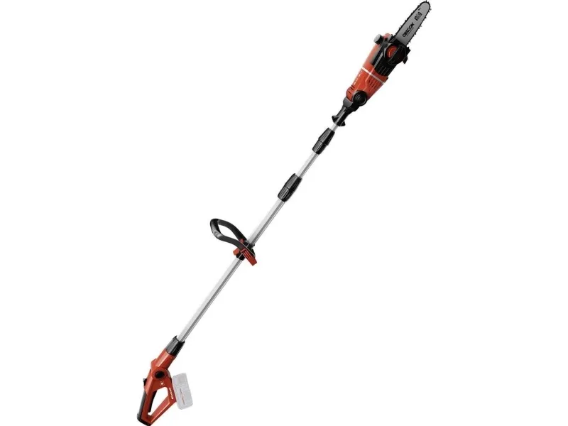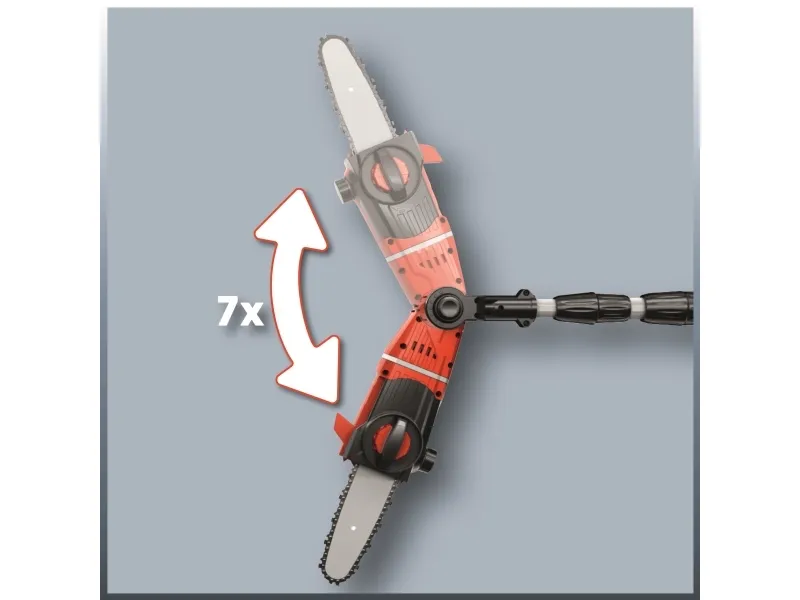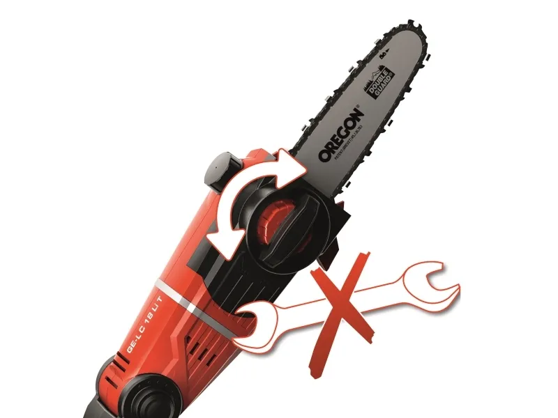 Tillsatsen kan vinklas 90° så att du enkelt kan göra vågräta snitt Motordelen kan vinklas i 7 lägen Handtaget kan vinklas i 4 lägen Justerbart teleskopskaft i aluminium (880-1820 mm) Justerbart stödgrepp med snabbspänne Svärd och kedja i hög kvalitet från OREGON Kedjesträckning och byte av sågkedja utan användning av verktyg Metallväxellåda ger lång driftlivslängd Barkstöd Kedjesträckarskruv Bärrem Oljetank för automatisk kedjesmörjning Levereras utan batteri och laddare (köps separat) Svärdlängd: 200 mm Skärlängd: 170 mm Kedjehastighet: 3,76 m/s Längd på teleskopskaft: 183 - 277 cm Grensåg med teleskopskaft GE-LC 18 Li T-Solo 6773209