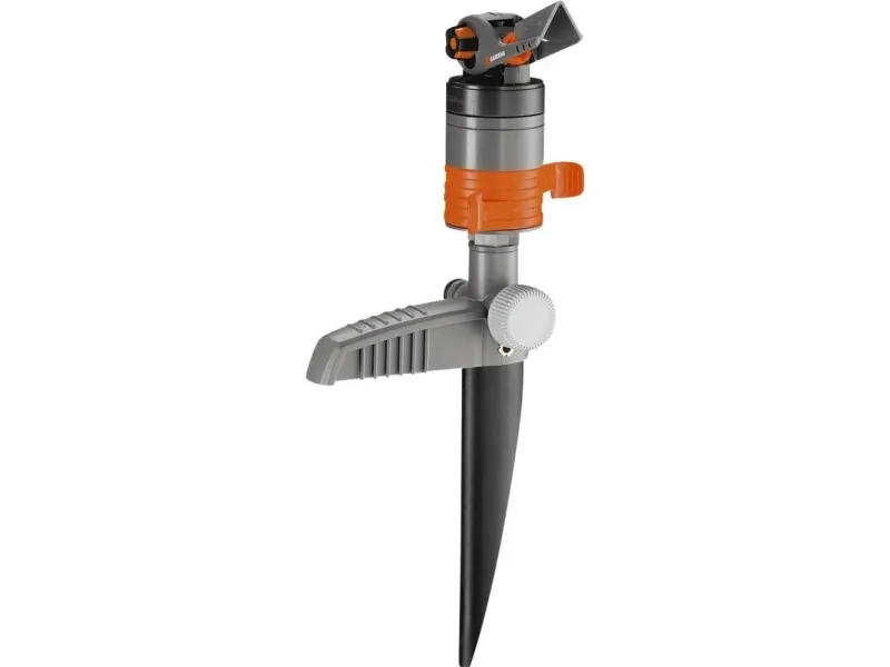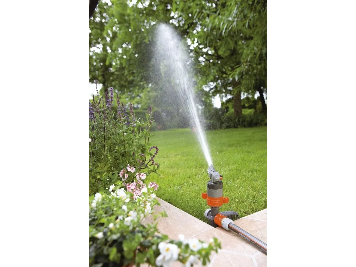With the GARDENA Comfort Turbo-Drive Sprinkler, you can quietly irrigate your lawn. It is made of sturdy plastic and is thereby very low-noise. The dirt-resistant, turbodrive gear is patented. It works whisper-quietly and evenly distributes the water, thanks to the 2-zone watering and specially shaped deflector. On the specially assembled adjustment rings, you can easily set the sector to be irrigated with fine range selection from 20° to 360°. The selected sector can be well viewed from these adjustment rings at any time. With the large, easy-to-use rotary knob, you can set the range. This can be set from 5 m to maximum 12 m. An area from 75 m² to maximum 450 m2 can be irrigated. The sprinkler is mounted on a plastic spike. This allows secure positioning in the lawn. And it can just as easily be removed and placed in another spot. The sprinkler is equipped with the GARDENA System Connector and the end cap. You can use it right away in your garden. A fine-mesh, easily removable filter catches dirt. It can be easily removed and cleaned. If you would like to water a larger area, simply connect several sprinklers using the GARDENA Tap Connector (Art. No. 901). For convenient irrigation of your garden.