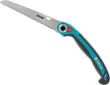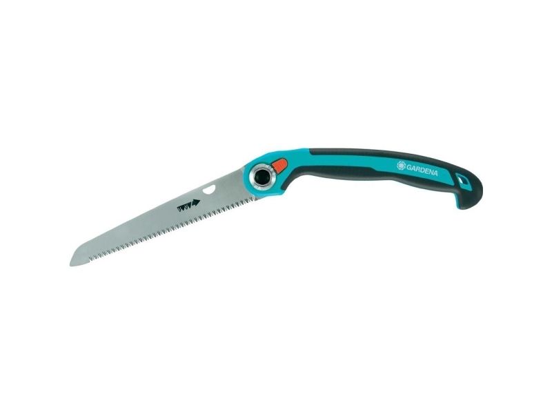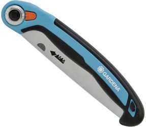 The Gardener’s Folding Saw 200 P belongs to the new generation of GARDENA saws. This saw has a total length of 215 mm, making it an easy-to-use all-rounder for cutting back thicker branches. It is ideal for all minor sawing work in the garden, and also for outdoor activities. It is lightweight and effective at the same time. The hard-chrome-plated saw blade has impulse-hardened precision toothing with triple grinding, which ensures fast results with little use of force, and a superb, precise cut. Notching in particular is made substantially easier. Rust has no chance to attack. You can carry this handy Folding Saw around with you in the garden, for example by safely folding it and locking it securely to put your trouser pocket. Whenever you need your saw, simply open it up again using the thumb hole. The lock button holds the saw securely and safely in three different settings. And if you don't require the saw, simply fold it together again. The saw blade will disappear safely into the beautifully-shaped handle. During sawing, a stop at the end of the handle prevents you from slipping. This has proven particularly useful during pulling movements, and assists you in making smooth progress. Thanks to the ergonomic, slightly angled handle shape and soft handle parts, this saw lies comfortably and safely in your hand. You can saw one-handed or two-handed as required. The saw can be stored without taking up much room and in a handy place using the eyelet. The warranty period totals 25 years.