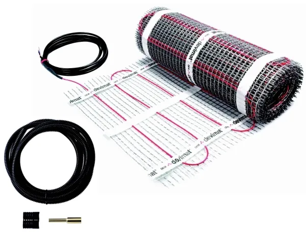 DEVImat 100T (100W/m²) är en tunn värmekabelmatta, självhäftande allt-i-ett-matta, med en mycket låg installationshöjd på endast 3,5 mm, perfekt för renovering av befintliga golv. Värmekablarna kan användas för både total- och komfortvärme. DEVImat är en 360° helt avskärmad dubbelledarvärmekabel av extremt hög kvalitet, med FEP-isolerade ledare och röd PVDF-ledarkapsel (inte UV-beständig). Den runda profilen och den robusta konstruktionen säkerställer både en snabb, enkel och säker installation. Kallmatningen är en installationskabel med solida ledare, vilket säkerställer en snabb installation. En väl synlig skarv förhindrar att värmekabeln oavsiktligt installeras i väggen.