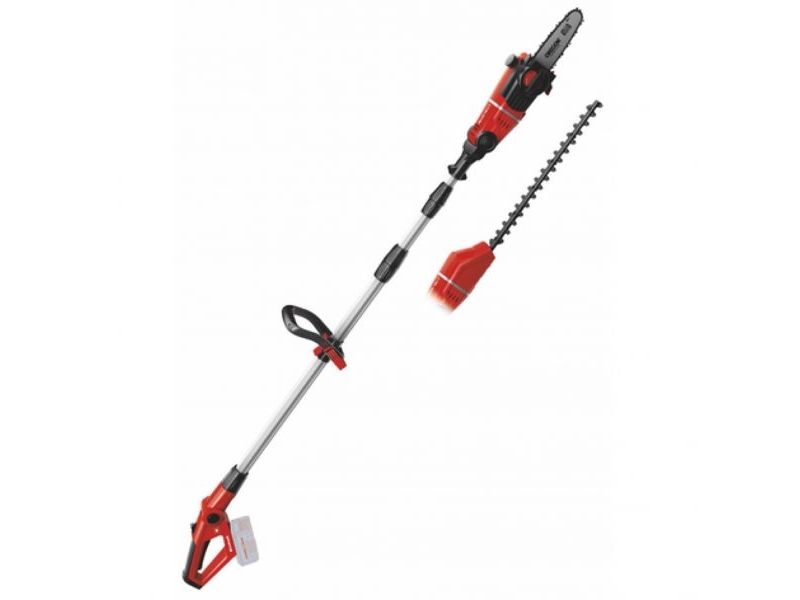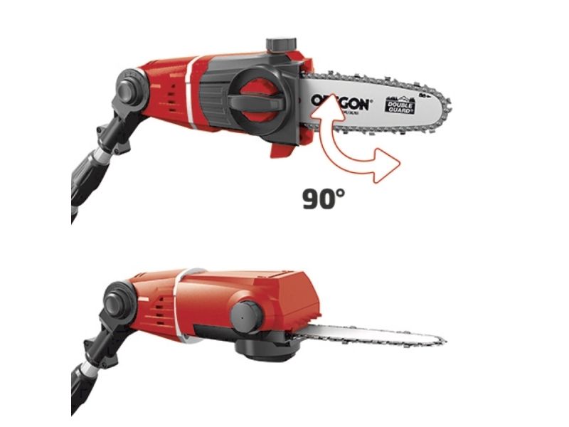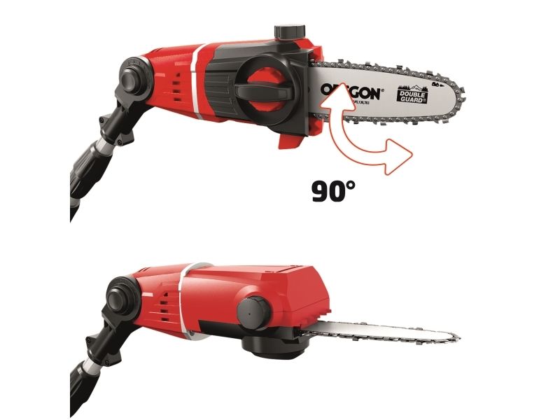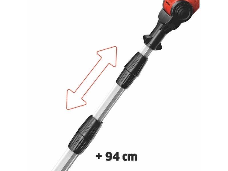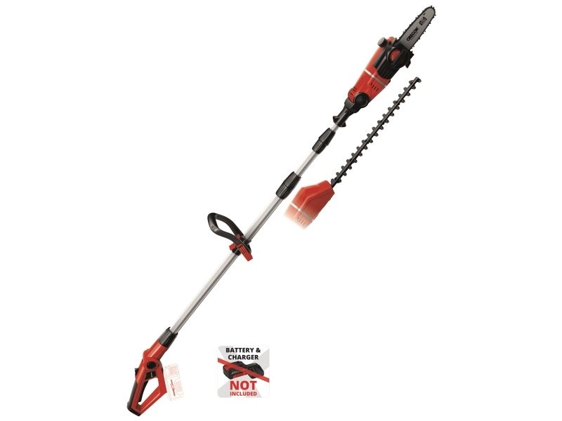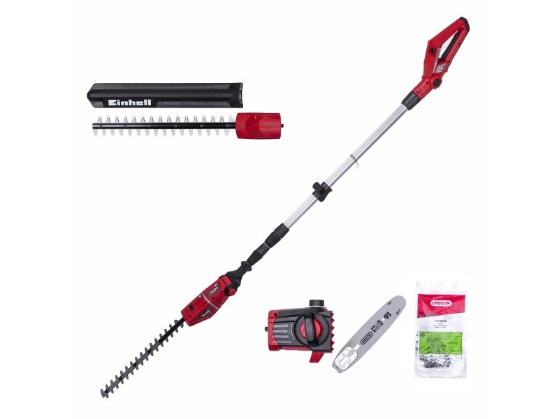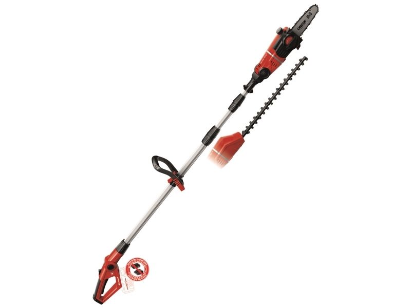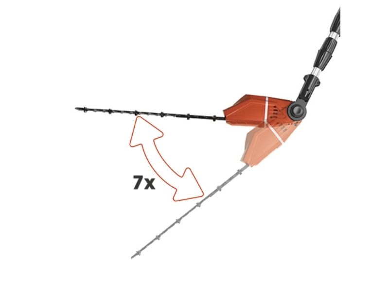 90° vridbar tillsats för lätta vågräta snitt Motordelen kan vinklas i 7 positioner Handtaget kan vinklas i 4 positioner Steglöst justerbart teleskopskaft i aluminium (880-1820 mm) Extra justerbart skaft med snabbkoppling Hållbar växellåda i metall OREGON-svärd och -kedja Sträckning och byte av kedja utan användning av verktyg Laserskuret och diamantslipat skär i stål Robust väska för transport och förvaring Bärrem Med oljetank för automatisk kedjesmörjning Levereras utan batteri och laddare (köps separat) Svärdlängd, kedjesåg: 200 mm Kedjehastighet: 3,76 m/s Max. klipplängd som häcksax: 400 mm Avstånd mellan tänderna: 16 mm Klipp per minut: 1 700 v/min 6219941