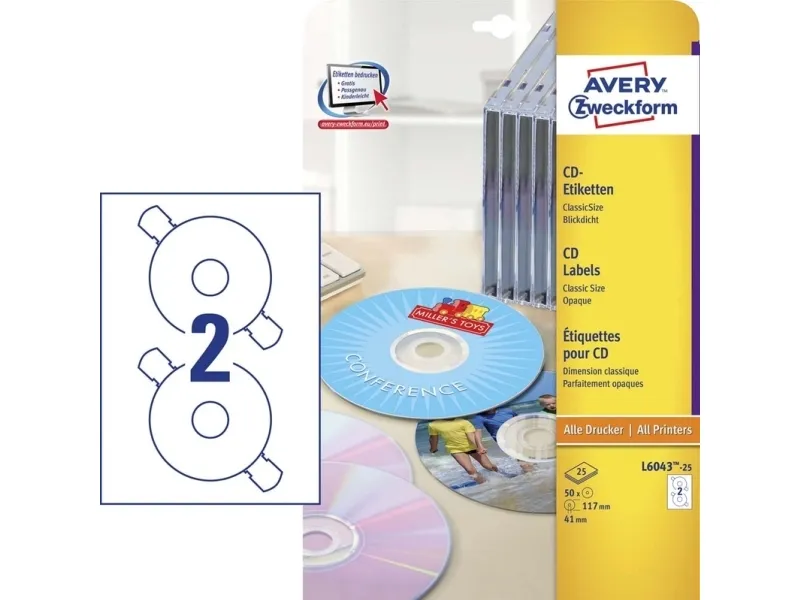 Avery’s L6043-25 hurtigtøende CD etiketter til alle printere med 2 etiketter/ark og 50 etiketter/pk giver dine brændte CD’er et professionelt udseende og giver dig et hurtigt overblik over data, billeder, musik osv. Classic Size CD etiketter dækker hele overfladen af CD'en på nær den midterste gennemsigte del af CD'en og giver dine CD’er et klassisk udseende. Matchende CD omslag kan let designes og printes særskilt. Etiketterne er optimeret til brug på CD'ere.